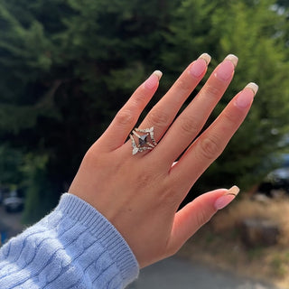This engagement ring features a 1.31 carat semi-translucent black speckled lozenge shaped rose cut diamond. The diamond is a top quality, all-natural stone that has not been heat treated or enhanced in any way. There are five sparkly GHSI white brilliant cut round accent diamonds set into the ring band on each side of the diamond for that extra sparkle!