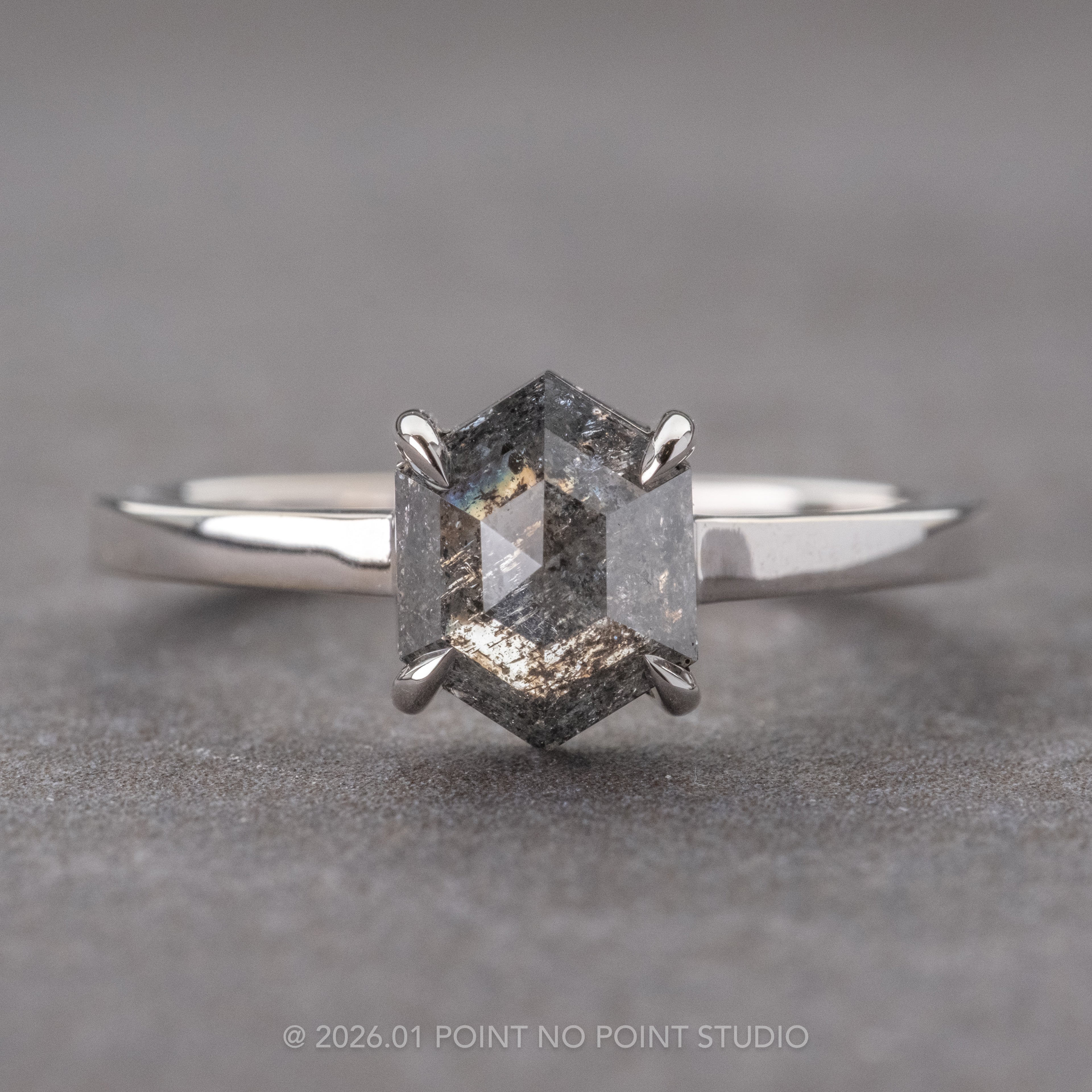 1.52 Carat Salt and Pepper Hexagon Diamond Engagement Ring, Jane Setting, 14k White Gold