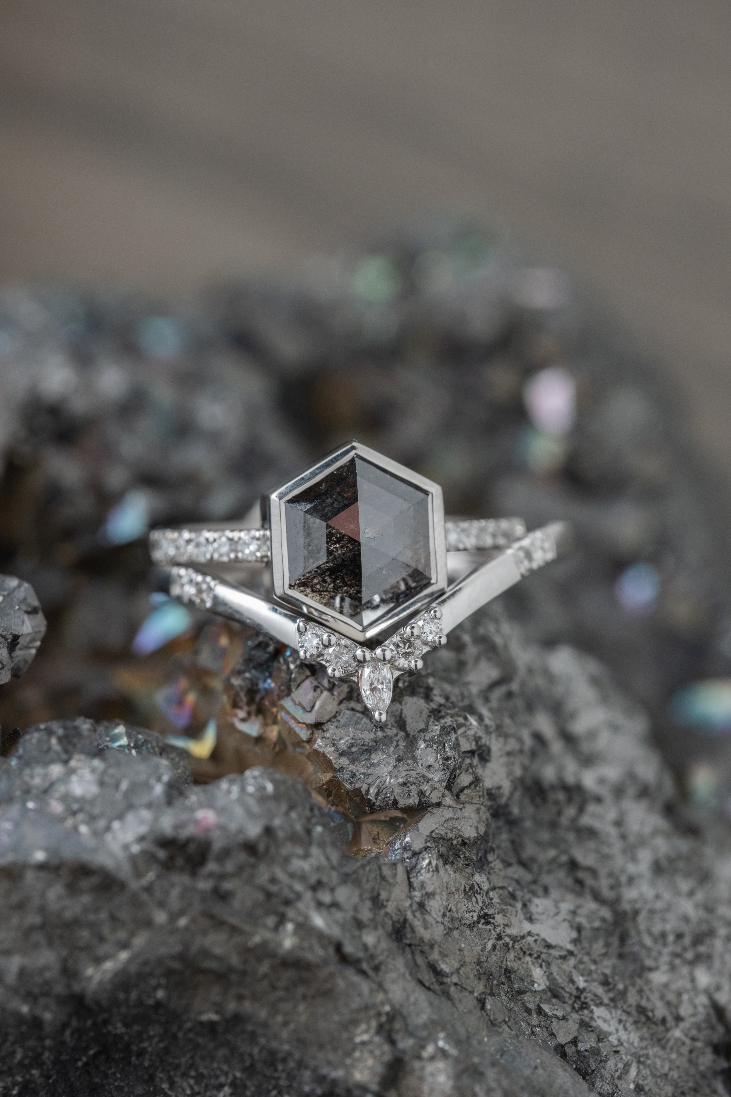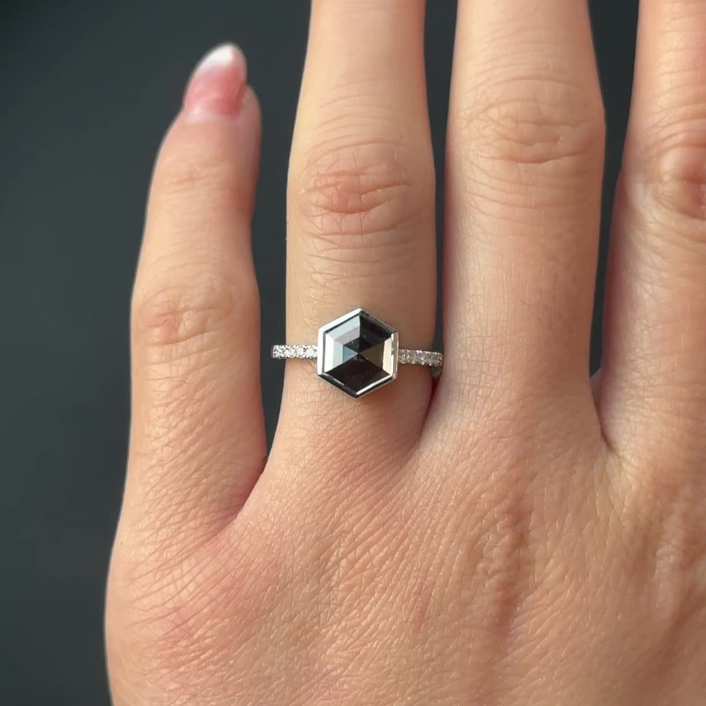This engagement ring features a 1.56 carat semi-translucent black speckled speckled rose cut hexagon shaped diamond. The diamond is a top quality, all-natural stone that has not been heat treated or enhanced in any way. There are five sparkly GHSI white brilliant cut round accent diamonds set into the ring band on each side of the hexagon diamond for that extra sparkle!