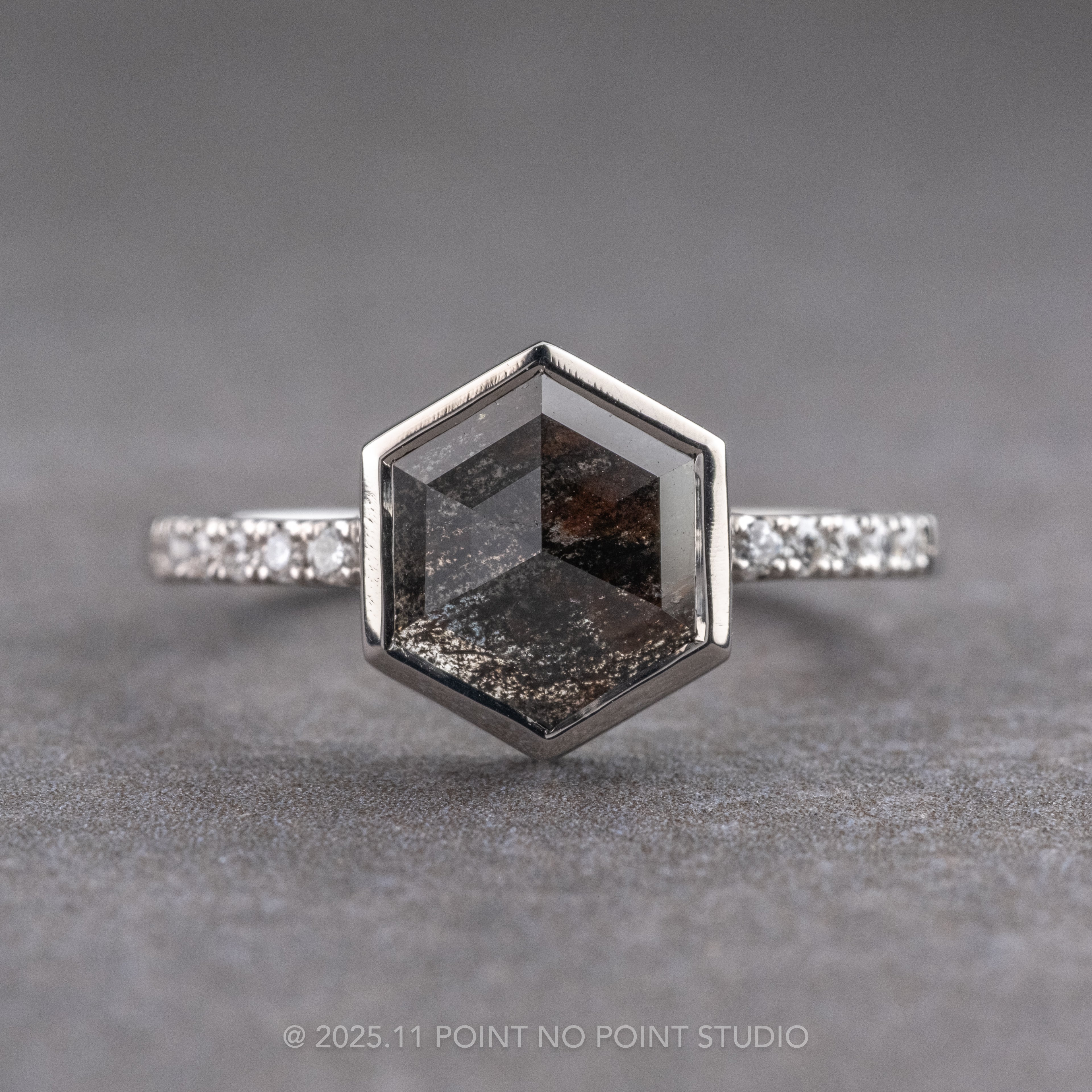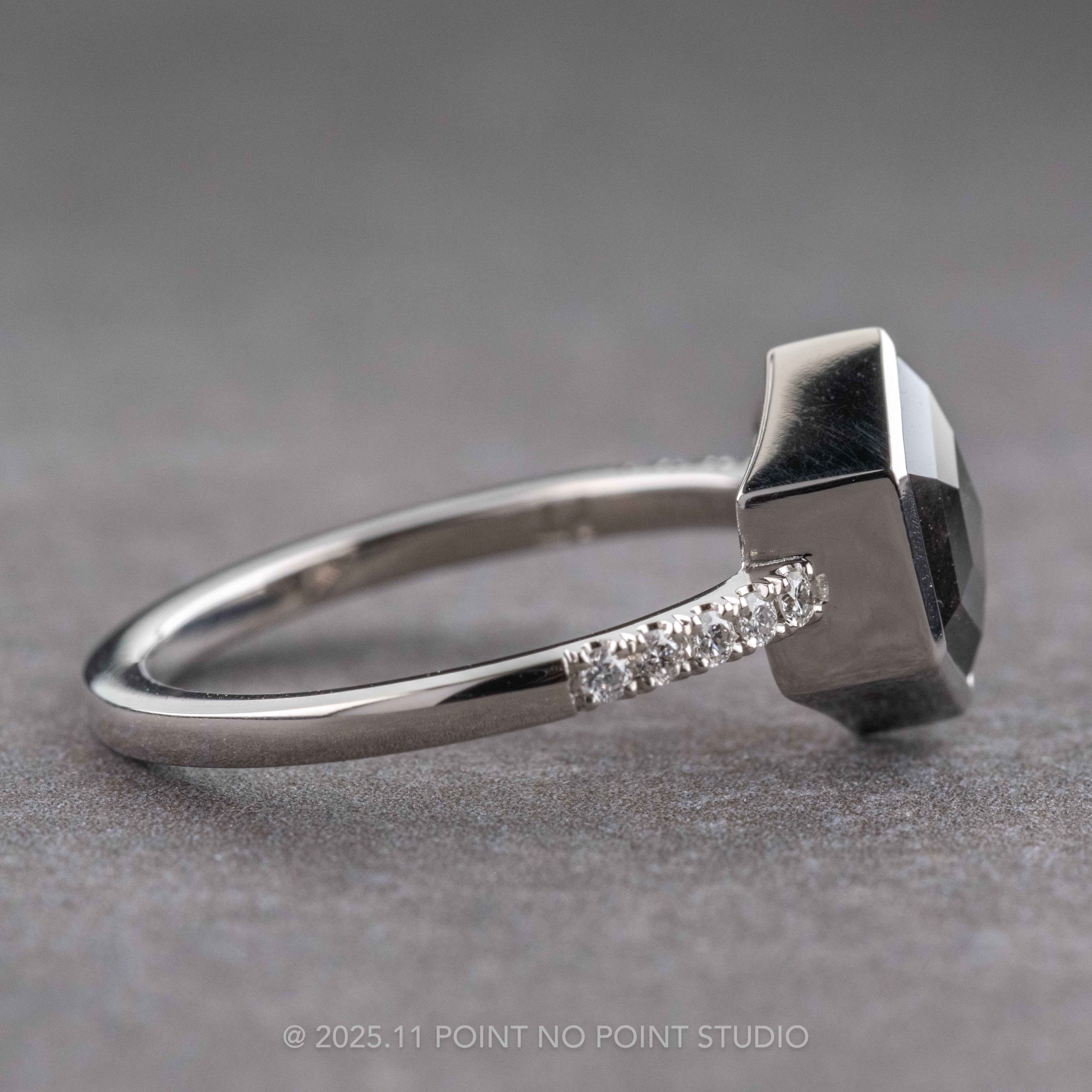1.66 Carat Black Speckled Hexagon Diamond Engagement Ring, Bezel Jules Setting, Platinum