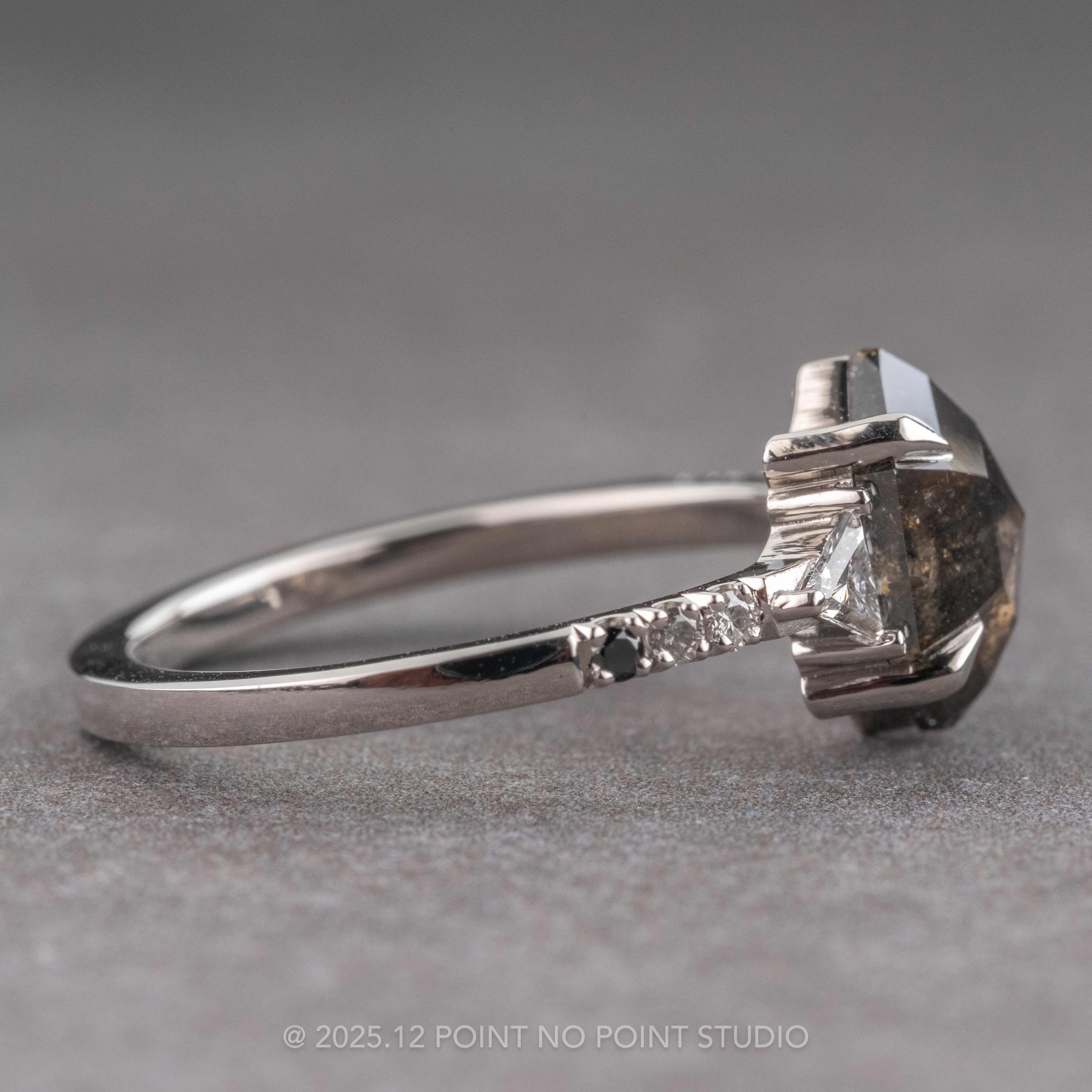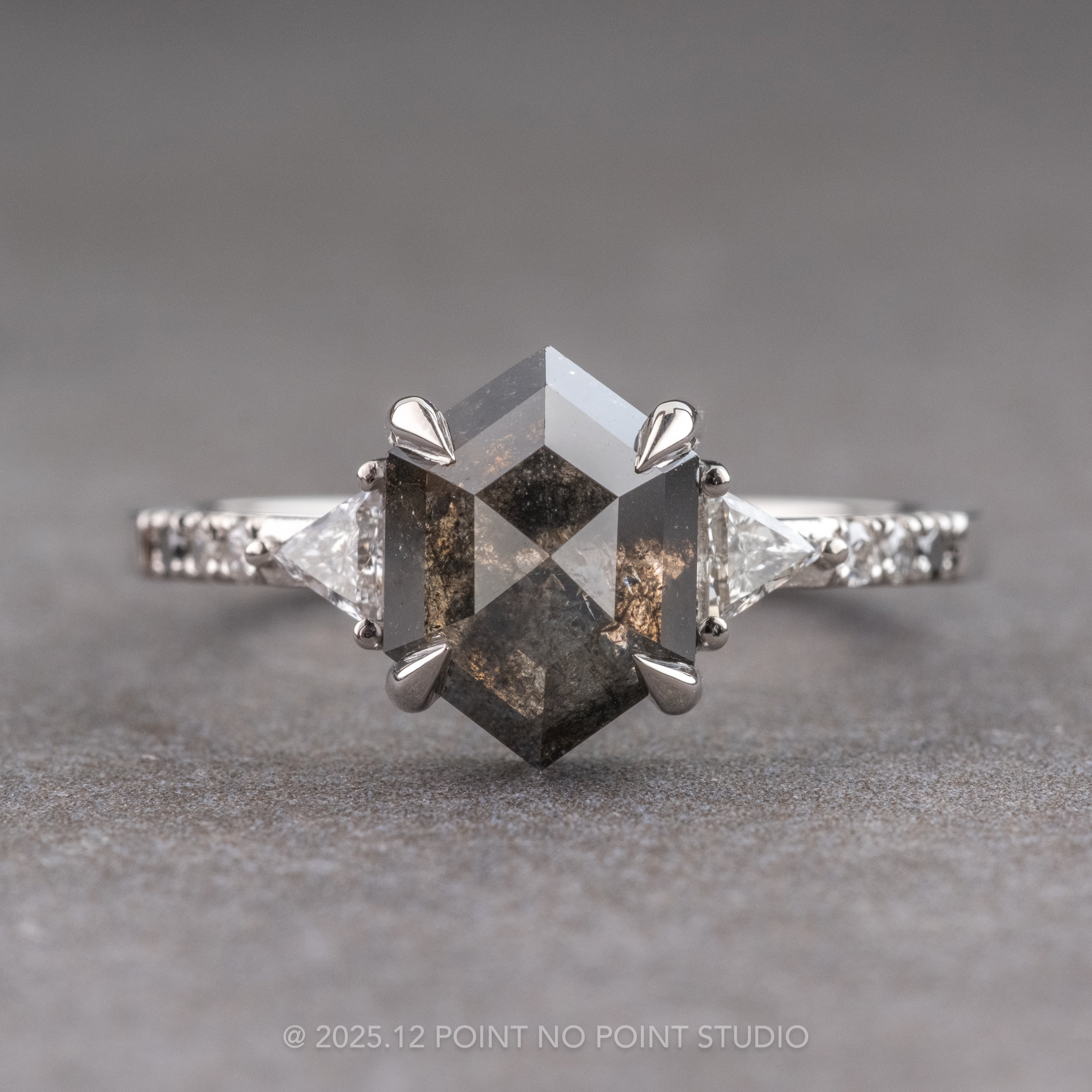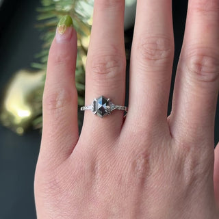 This engagement ring features a striking 1.57 carat black speckled rose cut hexagon shaped diamond. This diamond is an all-natural stone that has not been heat treated or enhanced in any way. Flanked on both sides by a GH-SI white triangle cut accent diamonds. Followed by three ombre diamonds down each side of the rings band - white closest to the larger white accent diamond, grey and black most outward on band.