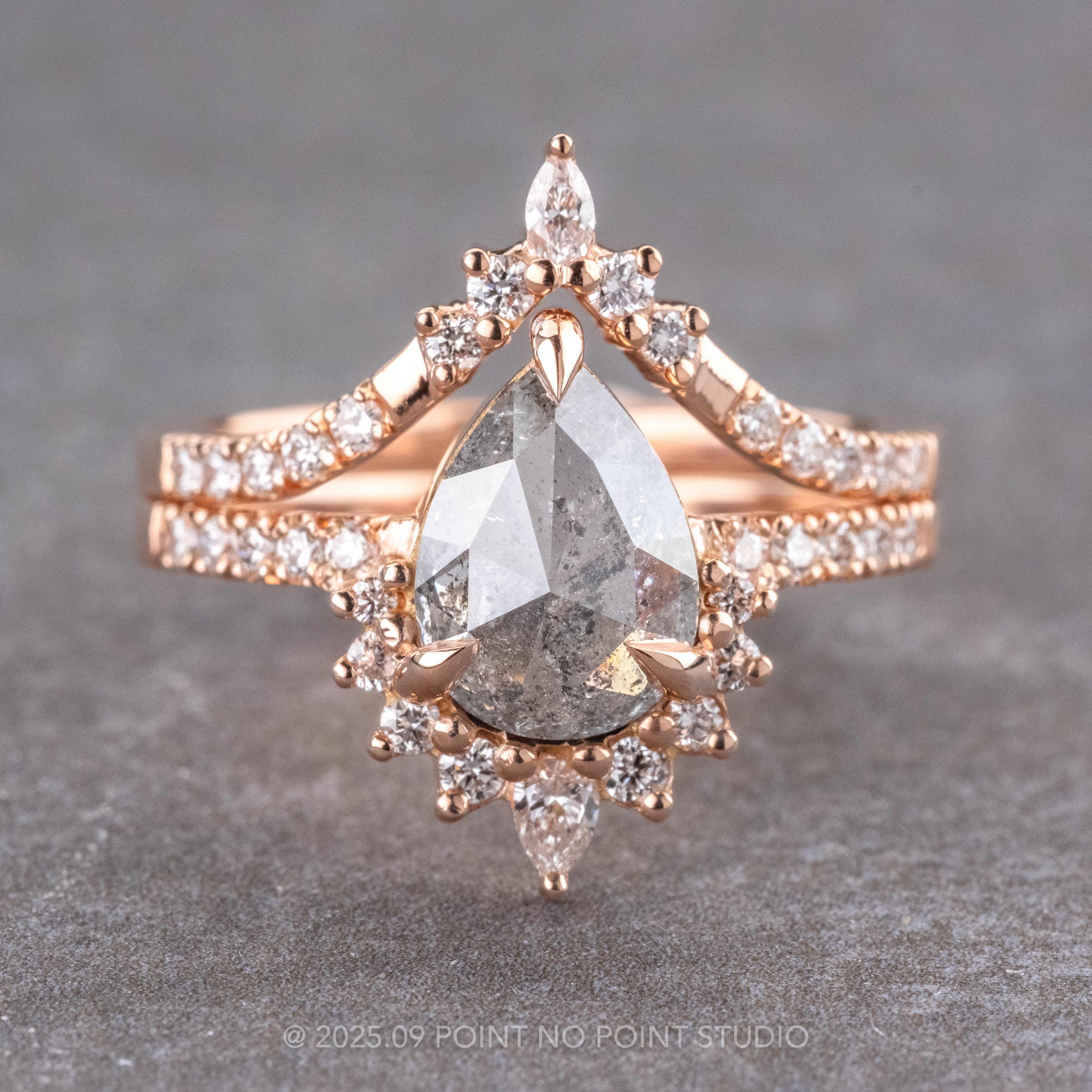 This timeless engagement ring features a 1.49 salt and pepper pear shaped rose cut diamond. The diamond is a top quality un-enhanced natural diamond; it is semi-translucent with unique tones and facets that catch the light. The pear diamond sits on top of a sparkly half-halo of faceted GHSI white diamonds with the focal point being a white pear diamond. Set into the band are five GHSI faceted white diamonds to complete the look!