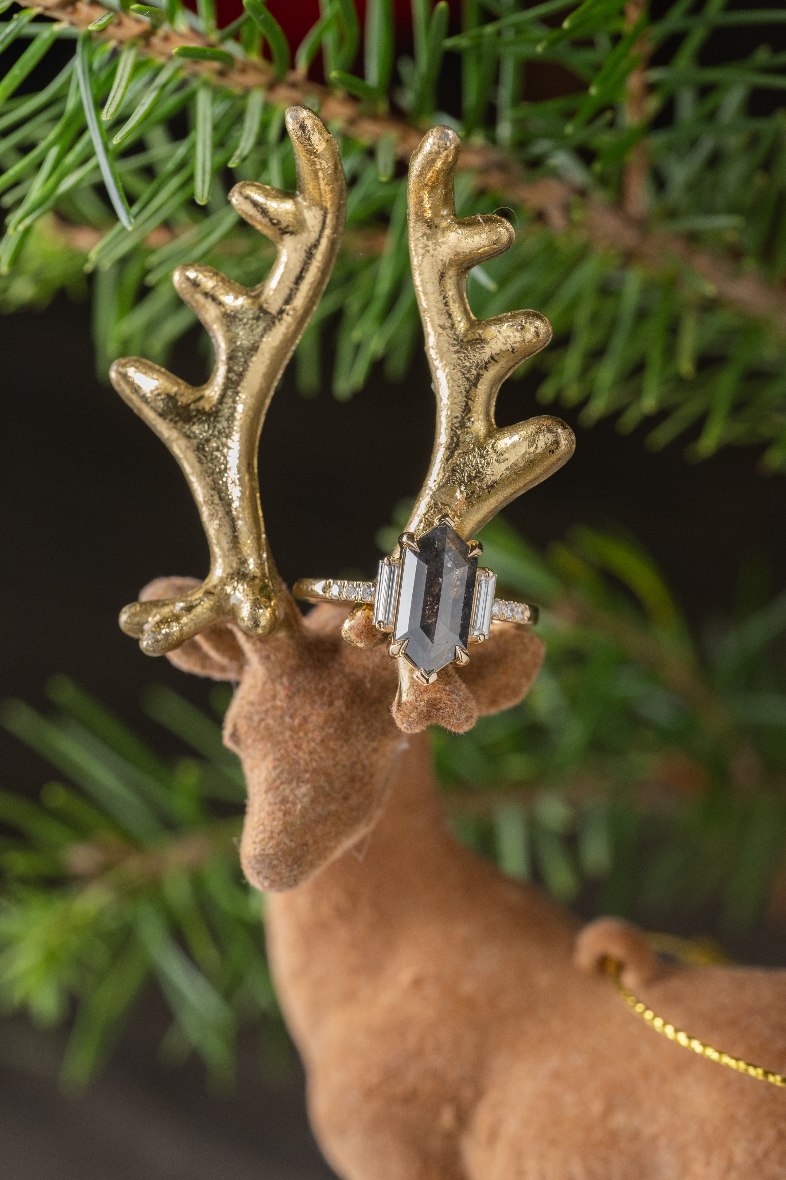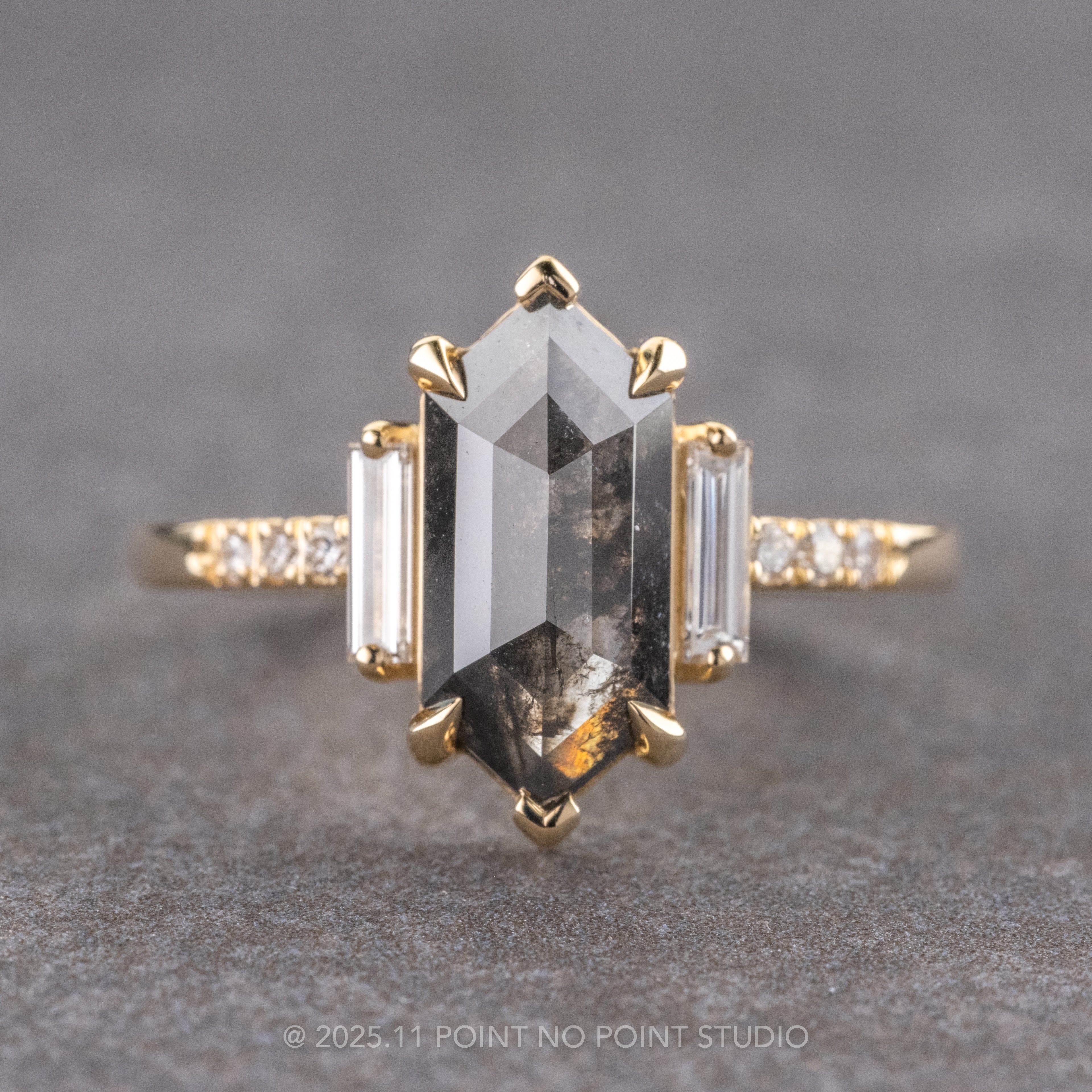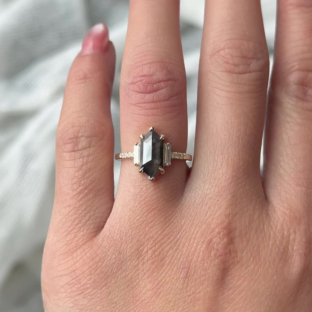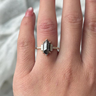 1.94 Carat Black Speckled Hexagon Diamond Engagement Ring, Eliza Setting, 14K Yellow Gold