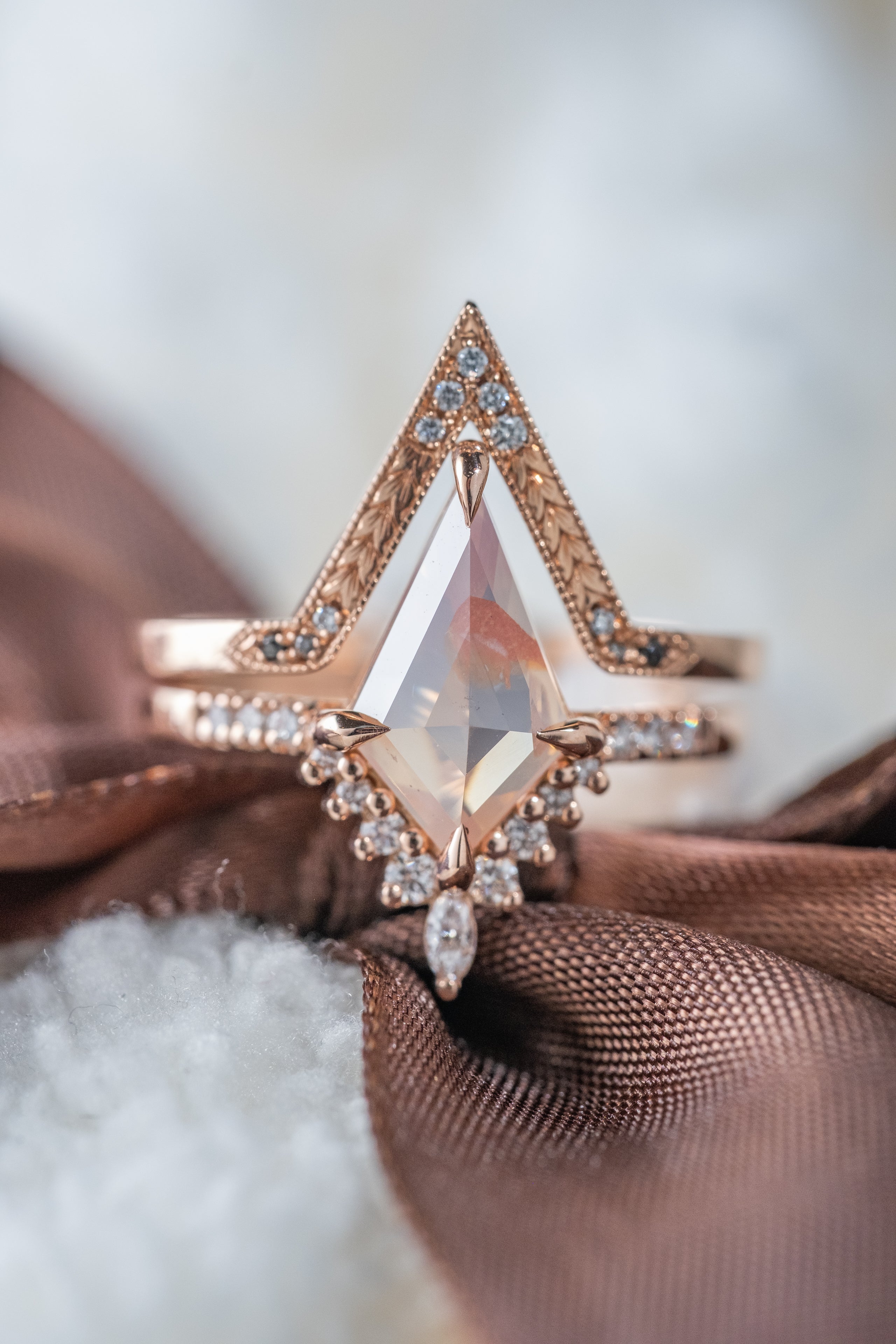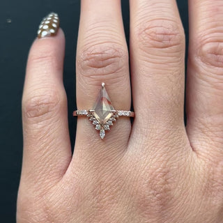 This timeless engagement ring features a 1.85 carat icy orange rose cut kite diamond. The diamond is a top quality un-enhanced natural diamond; it is semi-translucent with unique tones and facets that catch the light. The kite diamond sits on top of a sparkly half-halo of faceted white diamonds with the focal point being a white marquise diamond. Set into the band are three GHSI faceted white diamonds to complete the look!