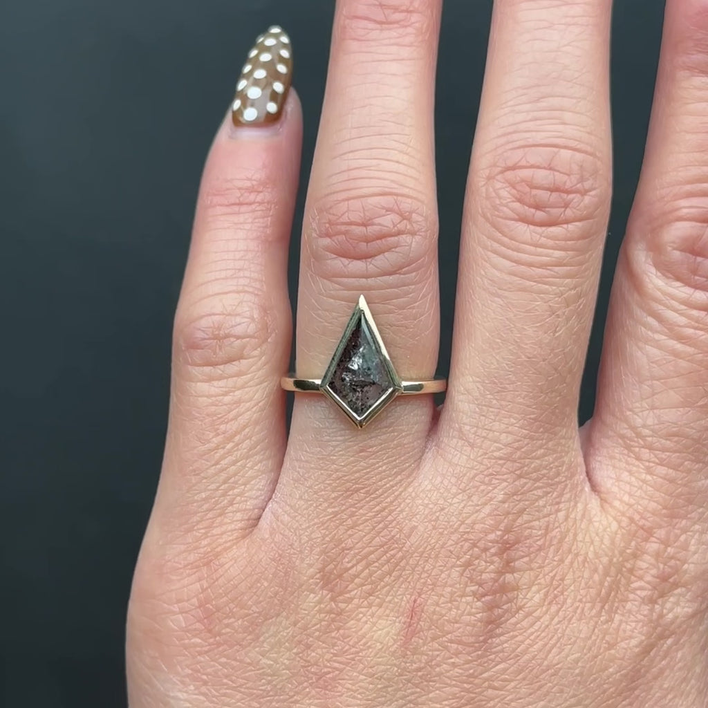 This ring features a striking 2.04 carat salt and pepper rose cut kite diamond. The kite is a top quality, natural diamond that has not been heated or treated in any way; it is semi-translucent with unique tones and facets that catch the light. This diamond sits in a bezel setting with an open back that allows light to shine through so you can admire the beautiful inclusions in the stone.