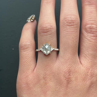 This engagement ring features a mesmerizing and incredibly sparkly 2.22 carat icy grey rose cut hexagon diamond. The hexagon is a top quality natural diamond; it is semi-translucent with unique tones and facets that catch the light. Flanked on either side by GHSI white triangle diamonds, followed by GHSI white round accent diamonds set into the band for that extra sparkle!
