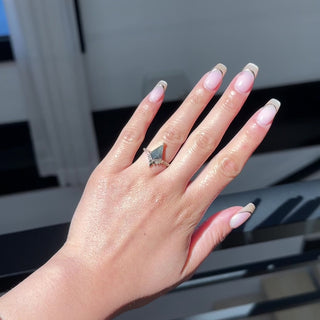 This timeless engagement ring features a 2.40 carat black speckled kite shaped diamond. The diamond is a top quality natural diamond; it is semi-translucent with unique facets that catch the light. The diamond is surrounded by a gradient of round brilliant cut diamonds with a sparkly black marquise diamond as the focal point. Followed by one white, grey and black brilliant cut diamond set into the band to complete the look!