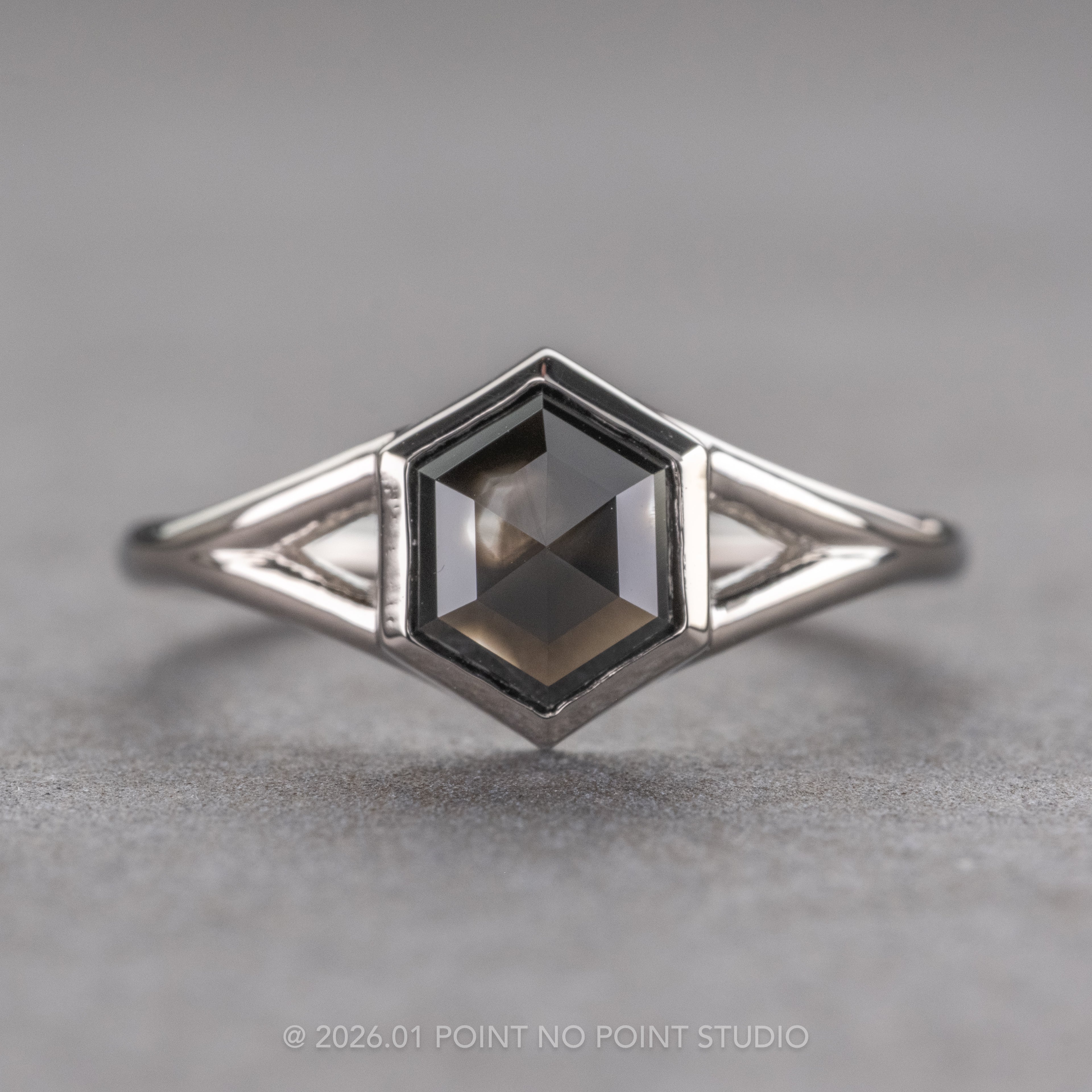 This ring features a natural stunning .83 carat smoky black hexagon shaped diamond. The hand cut diamond is a top quality natural, non enhanced diamond; it is semi-translucent with unique tones and facets that catch the light. This diamond sits in a bezel setting with an open back that allows light to shine through so you can admire the beautiful inclusions in the stone.