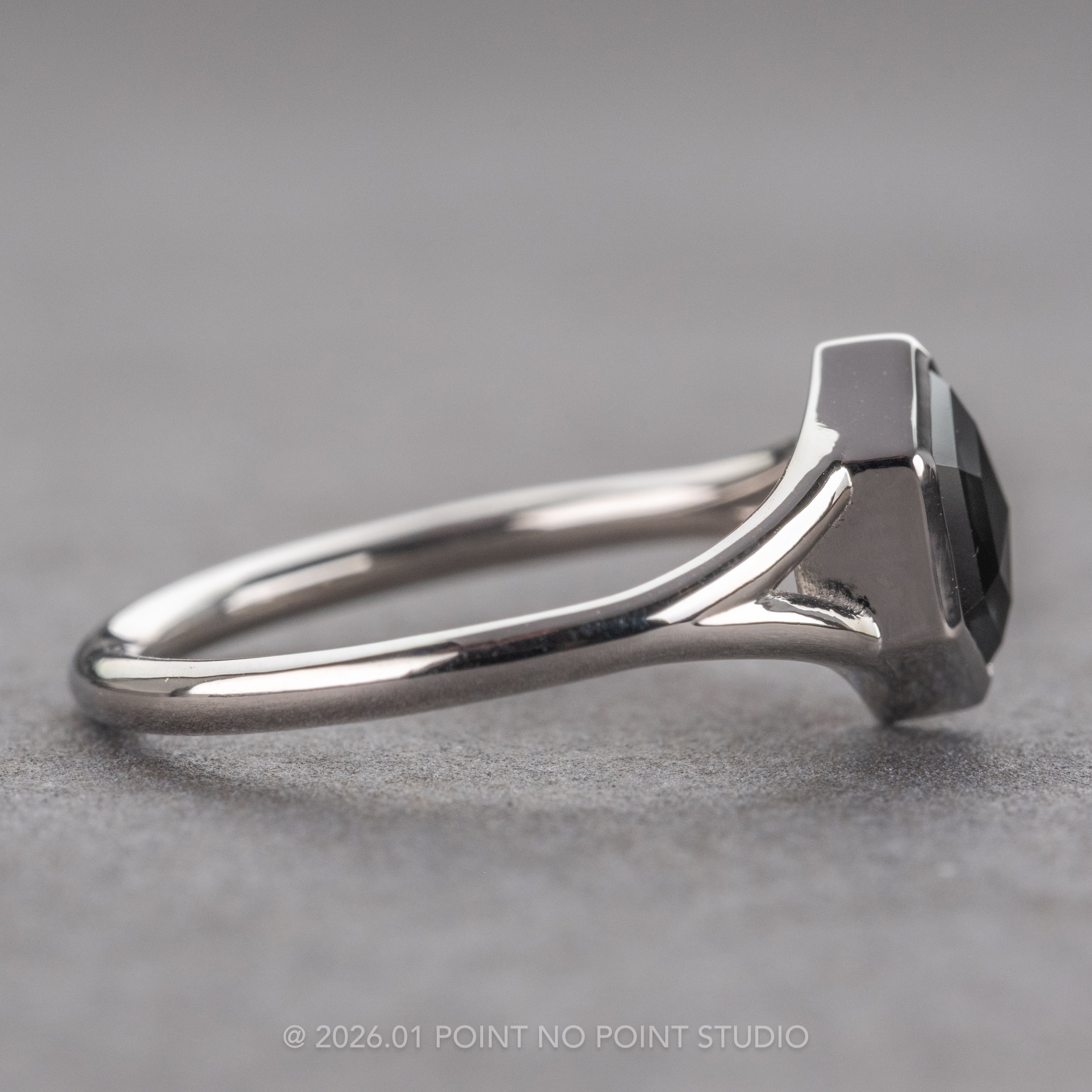 .83 Carat Black Hexagon Diamond Engagement Ring, Split Shank Bezel Jane Setting, Platinum