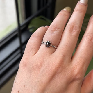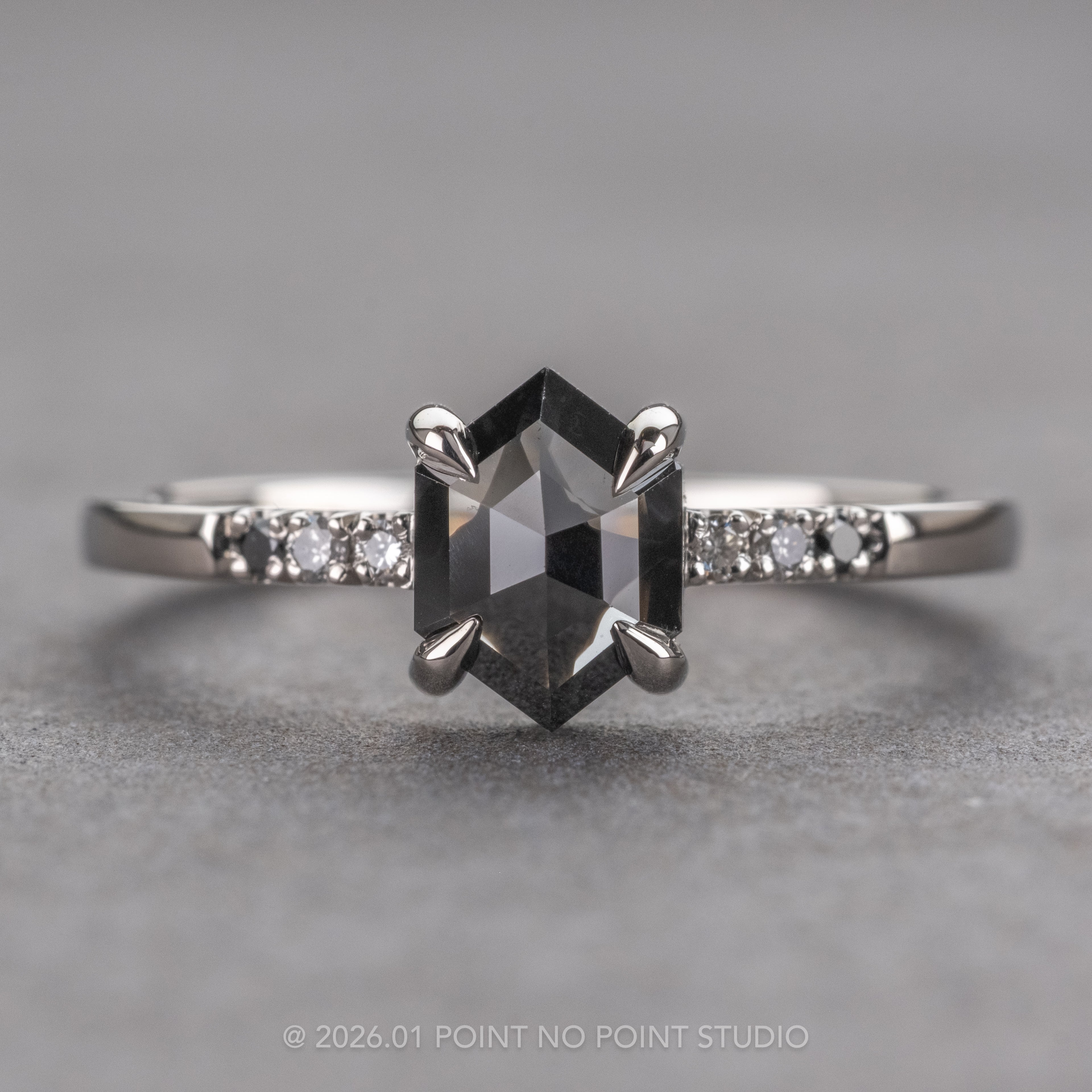 This engagement ring features a .80 carat semi-translucent black hexagon shaped rose cut diamond. The diamond is a top quality, all-natural stone that has not been heat treated or enhanced in any way. Flanked on either side by a white, grey and black diamond in the band to create a flawless ombre effect.