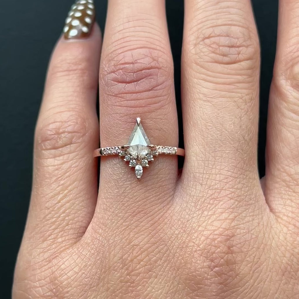 This timeless engagement ring features a .84 carat icy white rose cut kite diamond. The diamond is a top quality un-enhanced natural diamond; it is semi-translucent with unique tones and facets that catch the light. The kite diamond sits on top of a sparkly half-halo of faceted white diamonds with the focal point being a white marquise diamond. Set into the band are three GHSI faceted white diamonds to complete the look!