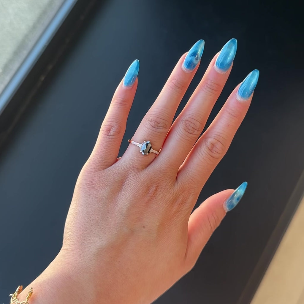 1.11 Carat Black Speckled Hexagon Diamond Engagement Ring, Eliza Setting, 14K Rose Gold