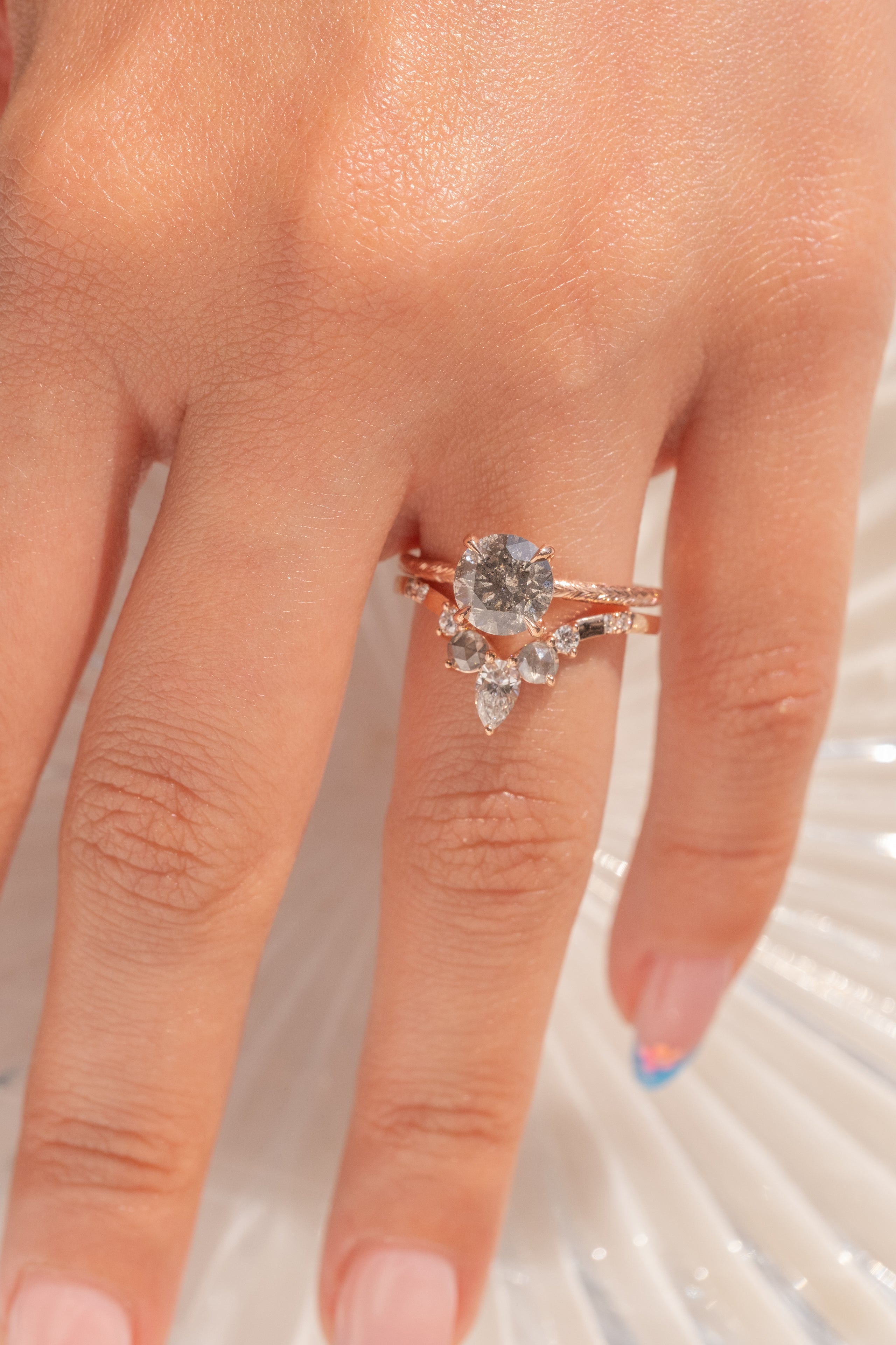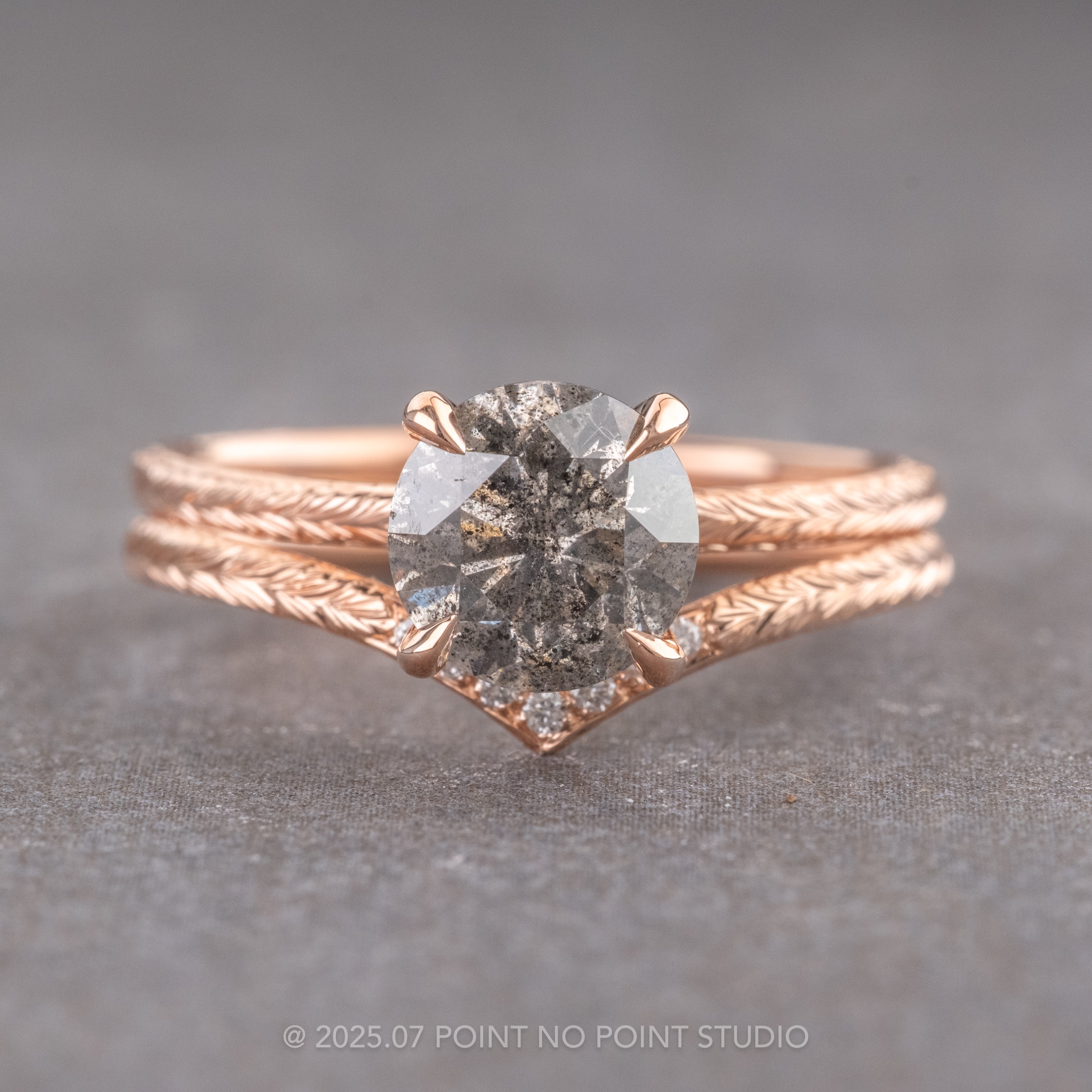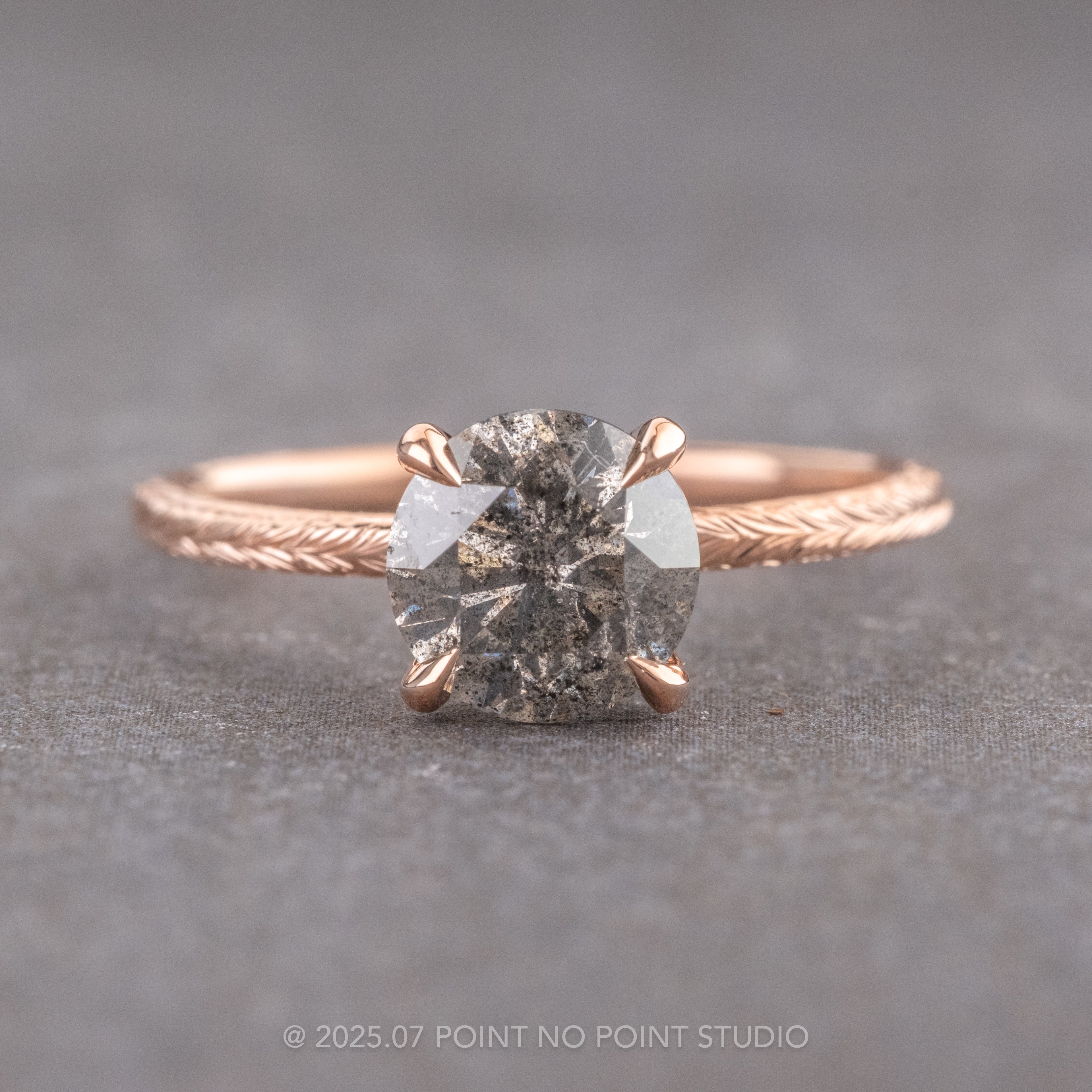 1.67 Carat Salt and Pepper Round Diamond Engagement Ring, Engraved Tulip Jane Setting, 14K Rose Gold
