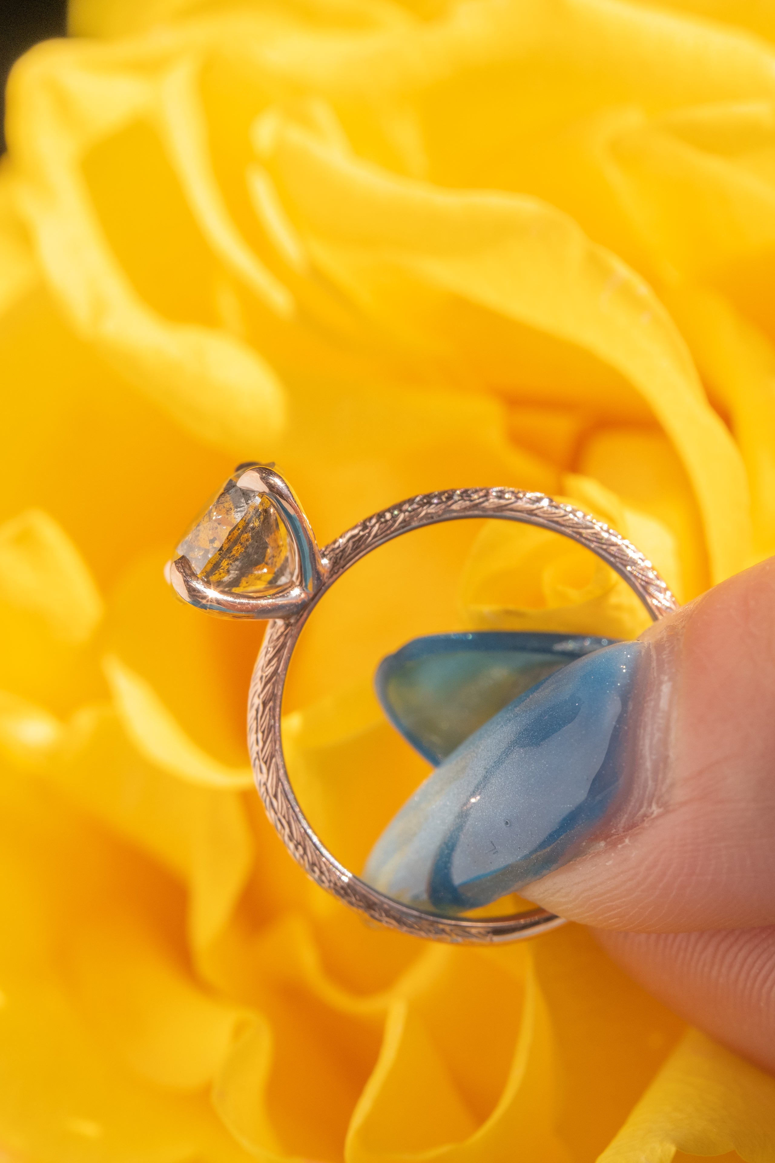 The entire ring is made of recycled 14k rose gold with a round ring band measuring 1.7mm wide. The shank is finished with our signature Jaylah wheat pattern - all done completely by hand!