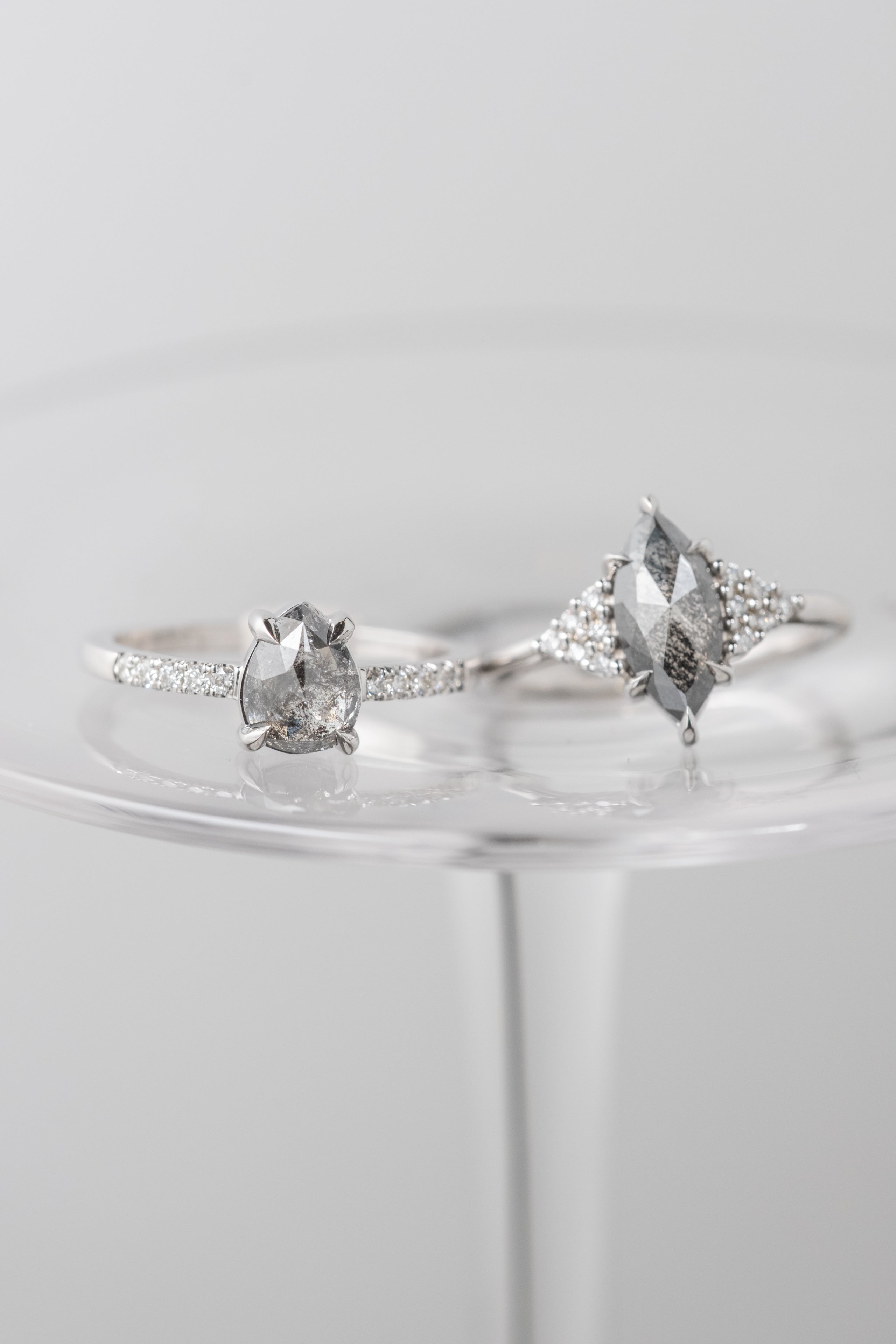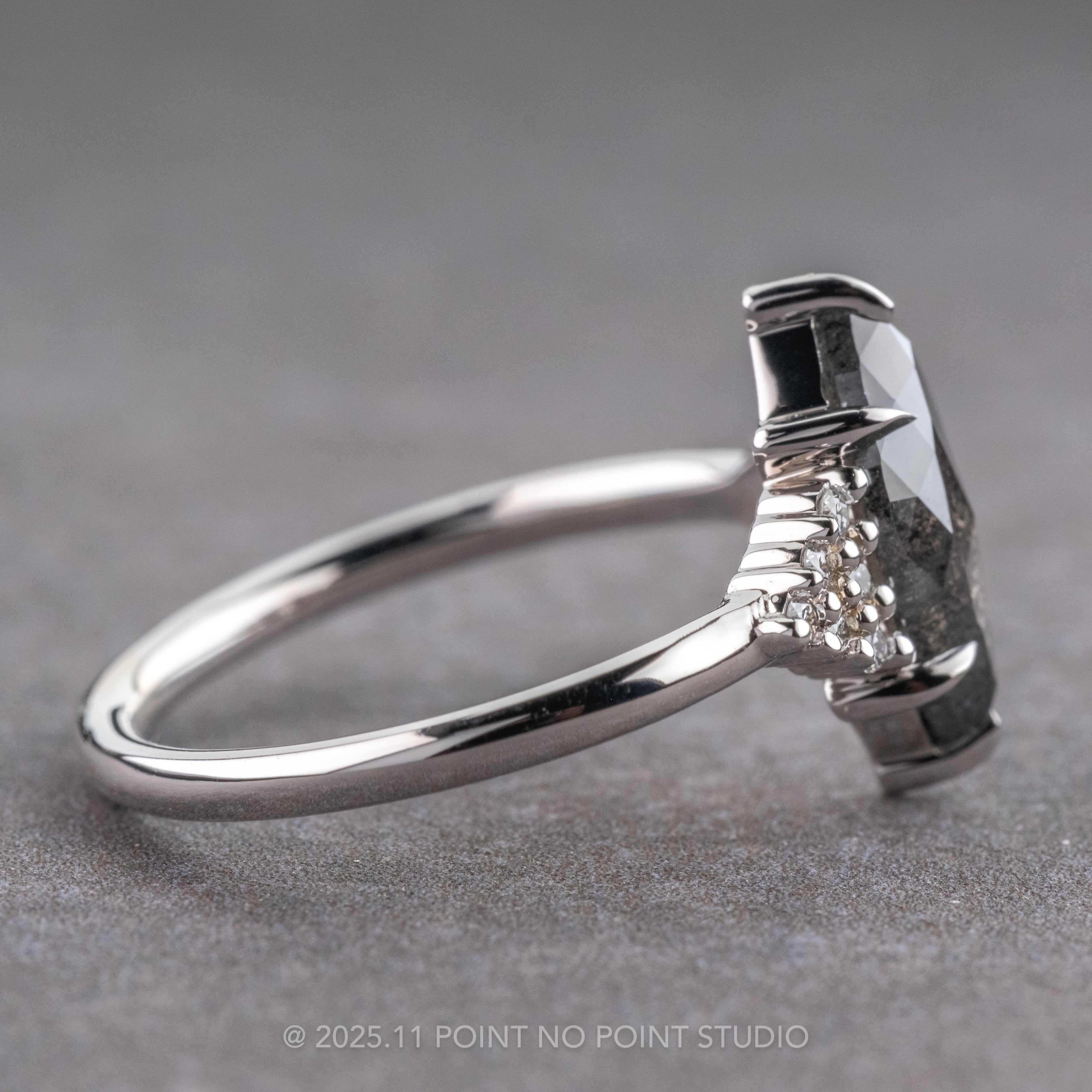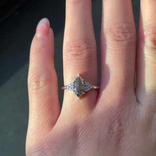 This beautiful and dainty ring features a 1.73 carat salt and pepper marquise rose cut diamond. The diamond is a top quality un-enhanced natural diamond; it is semi-translucent with unique tones and facets that catch the light. The marquise diamond is flanked on either side by a cluster of sparkly GHSI white round accent diamonds that taper seamlessly into the band.