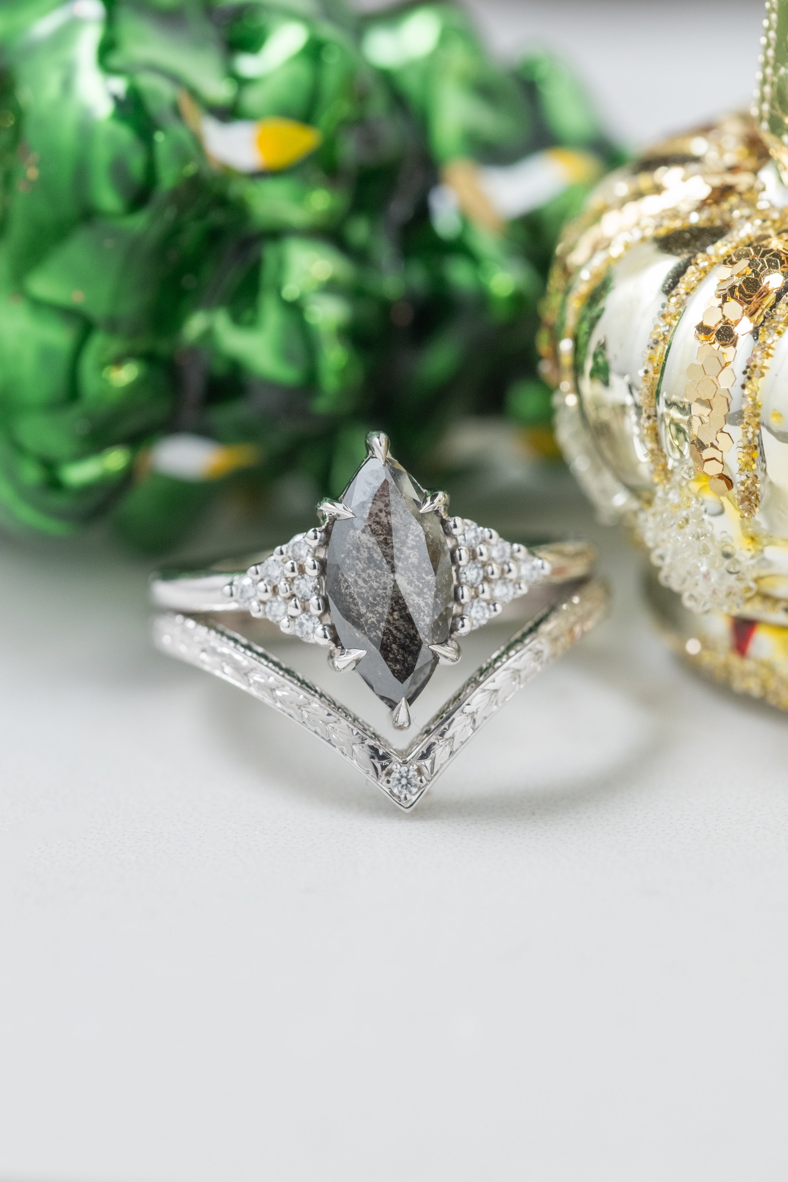 Black Speckled Marquise Diamond Engagement Ring
