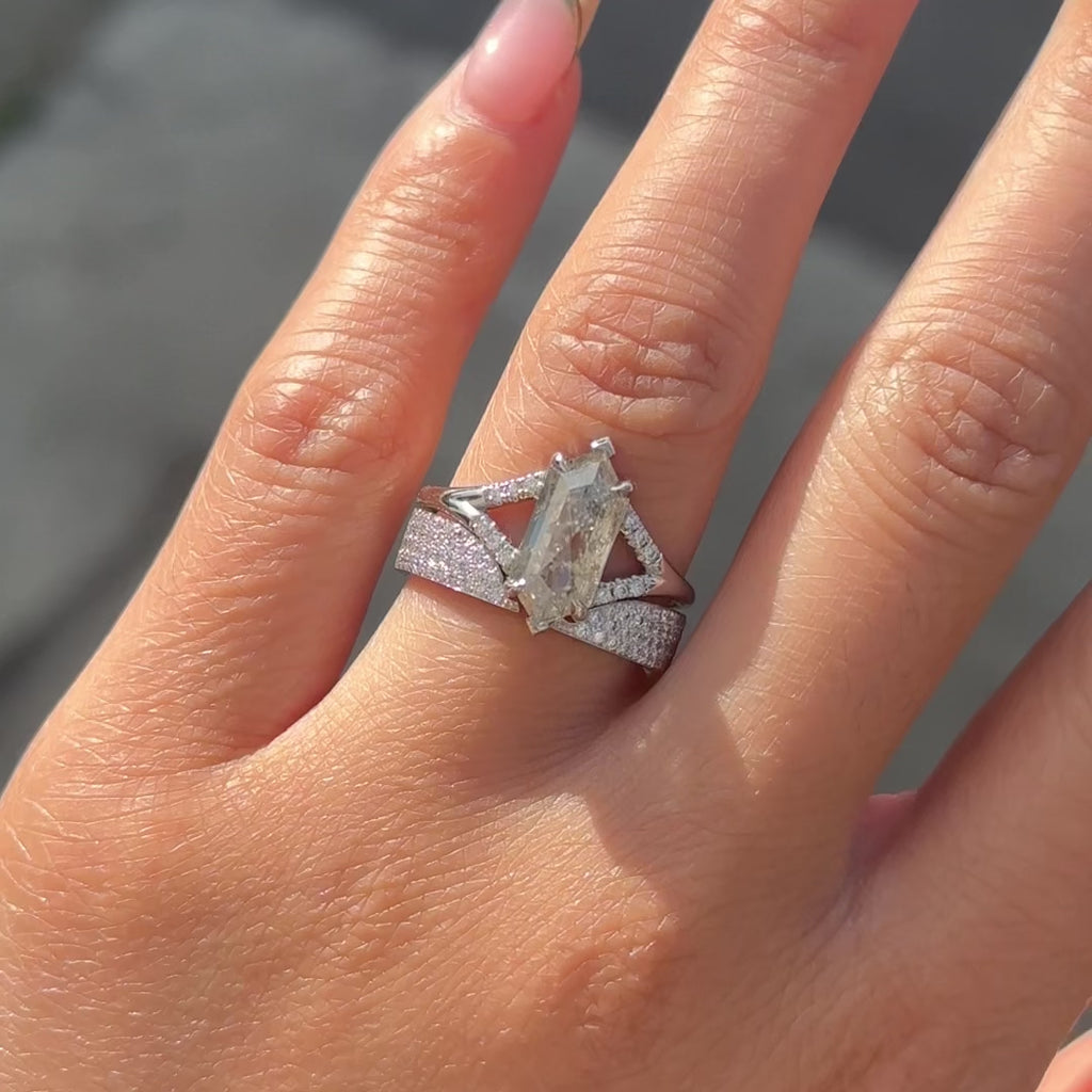 This captivating ring features a striking 1.79 carat salt and pepper hexagon rose cut diamond. The diamond is a top quality natural stone and is semi-translucent with pepper like speckling. The hexagon diamond is being held by 4 prongs and 2 chevron tips. Set into each arm of the split shank are white round accent diamonds for that extra sparkle!