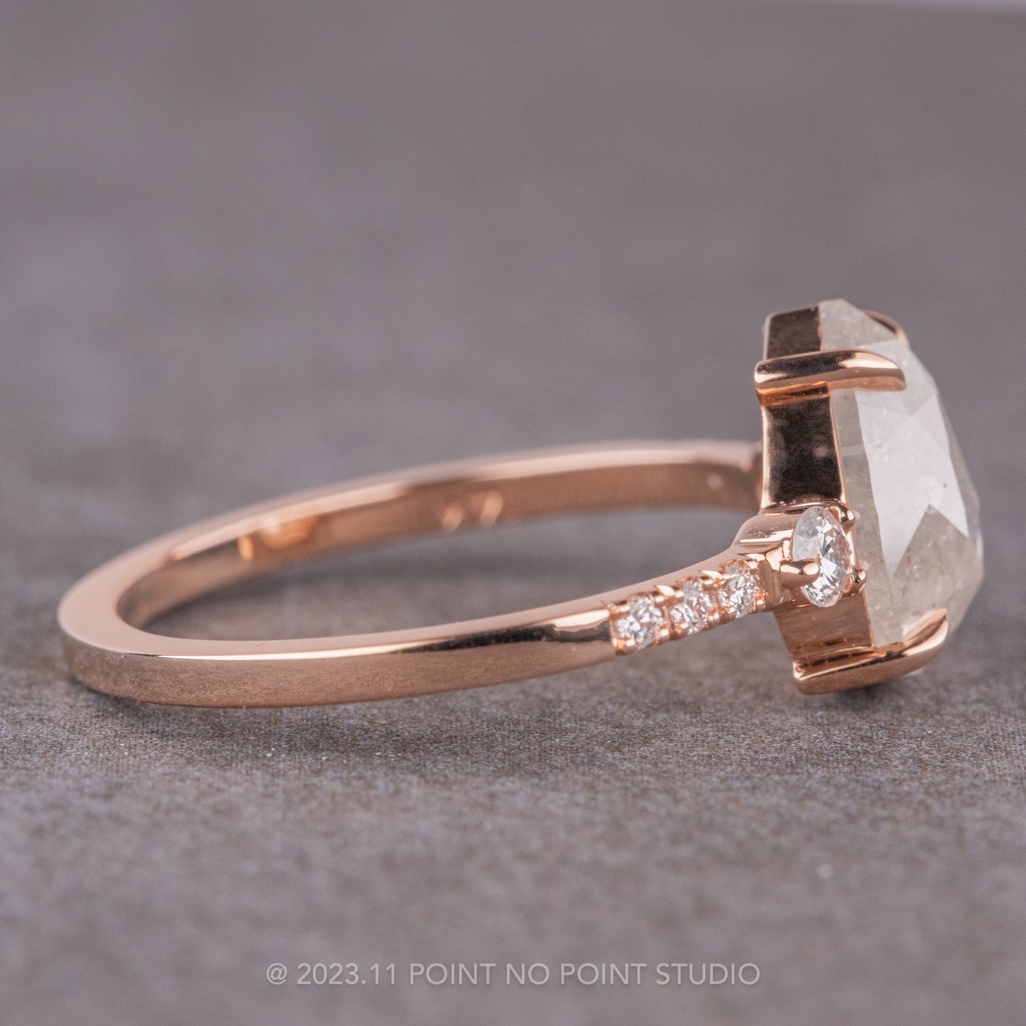 This engagement ring features a mesmerizing and incredibly sparkly 1.79 carat icy white pear shaped rose cut diamond. The pear diamond is a top quality natural diamond; it is semi-translucent with unique tones and facets that catch the light. Flanked on both sides by a GHSI white round brilliant cut accent diamond, followed by three smaller white round brilliant cut diamonds set into the ring band to complete the look.