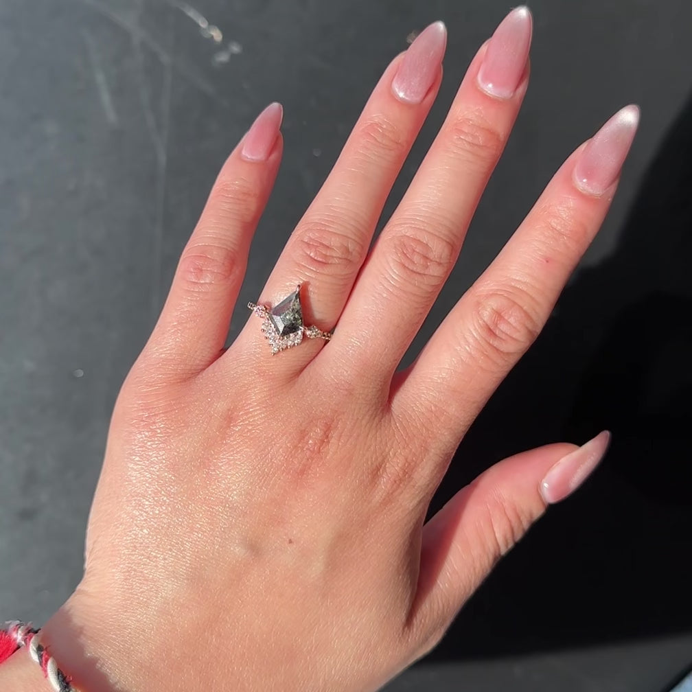 This timeless engagement ring features a striking 1.88 carat black speckled kite shaped diamond. The diamond is a top quality natural diamond and has been set in a low profile, 4 prong setting with a half-halo of faceted GH-SI white marquise diamonds. Set into the band on either side are 3 faceted black round diamonds to complete the look!