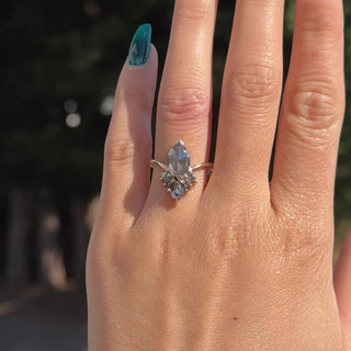 This timeless engagement ring features a 1.87 carat salt and pepper marquise rose cut diamond. The diamond is a top-quality, all-natural stone that has not been heat treated or enhanced in any way; it is semi-translucent with unique tones and facets that catch the light. Sitting under the center diamond is a gently sloping half-halo of salt and pepper marquise diamonds with a sparkly lozenge diamond as the focal point.