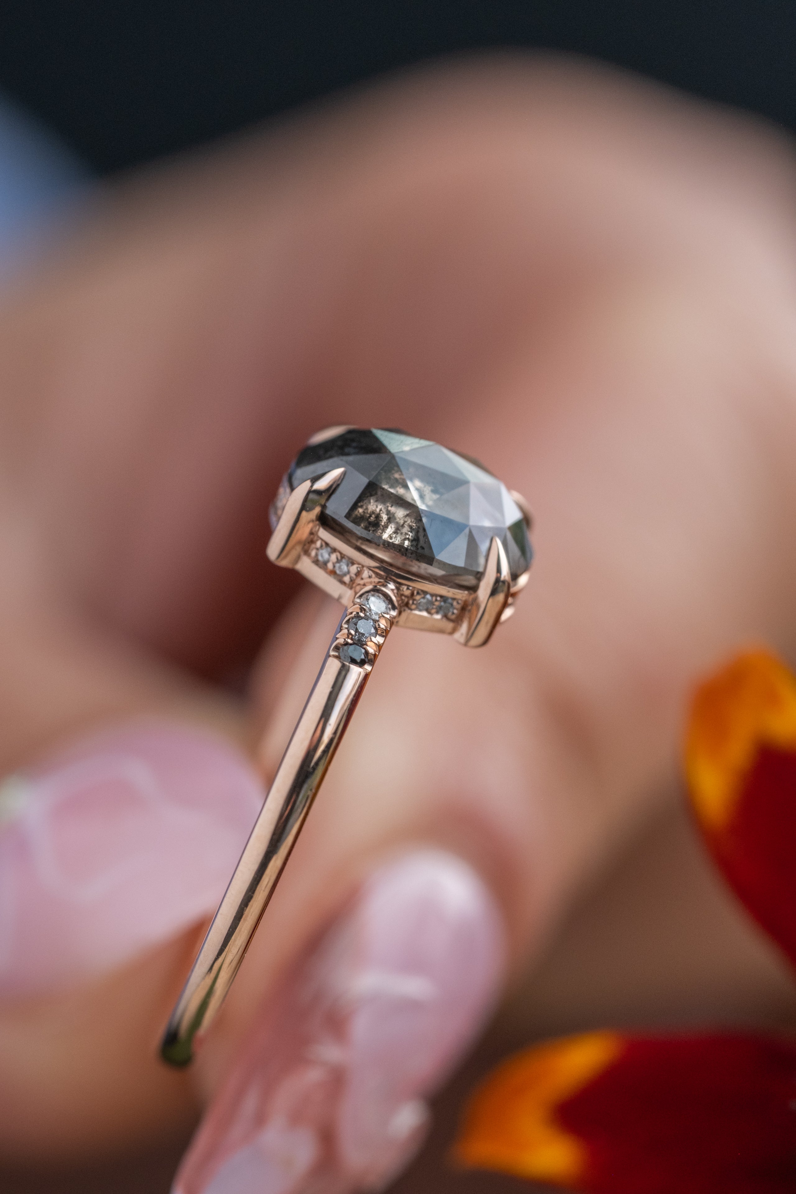 2.39 Carat Black Speckled Oval Diamond Engagement Ring, Ombre Juliette Setting, 14k Rose Gold