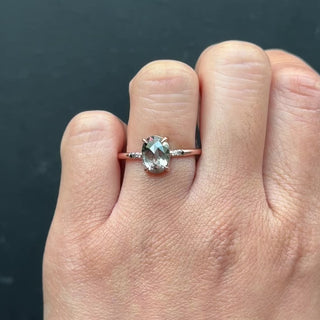 The rose cut diamond is set into a low profile, open back, 4 prong setting which allows you to see and admire the unique inner structure, tones, and marbling of the diamond. The entire ring is made of recycled 14k rose gold with a rounded ring band measuring 1.7mm wide.