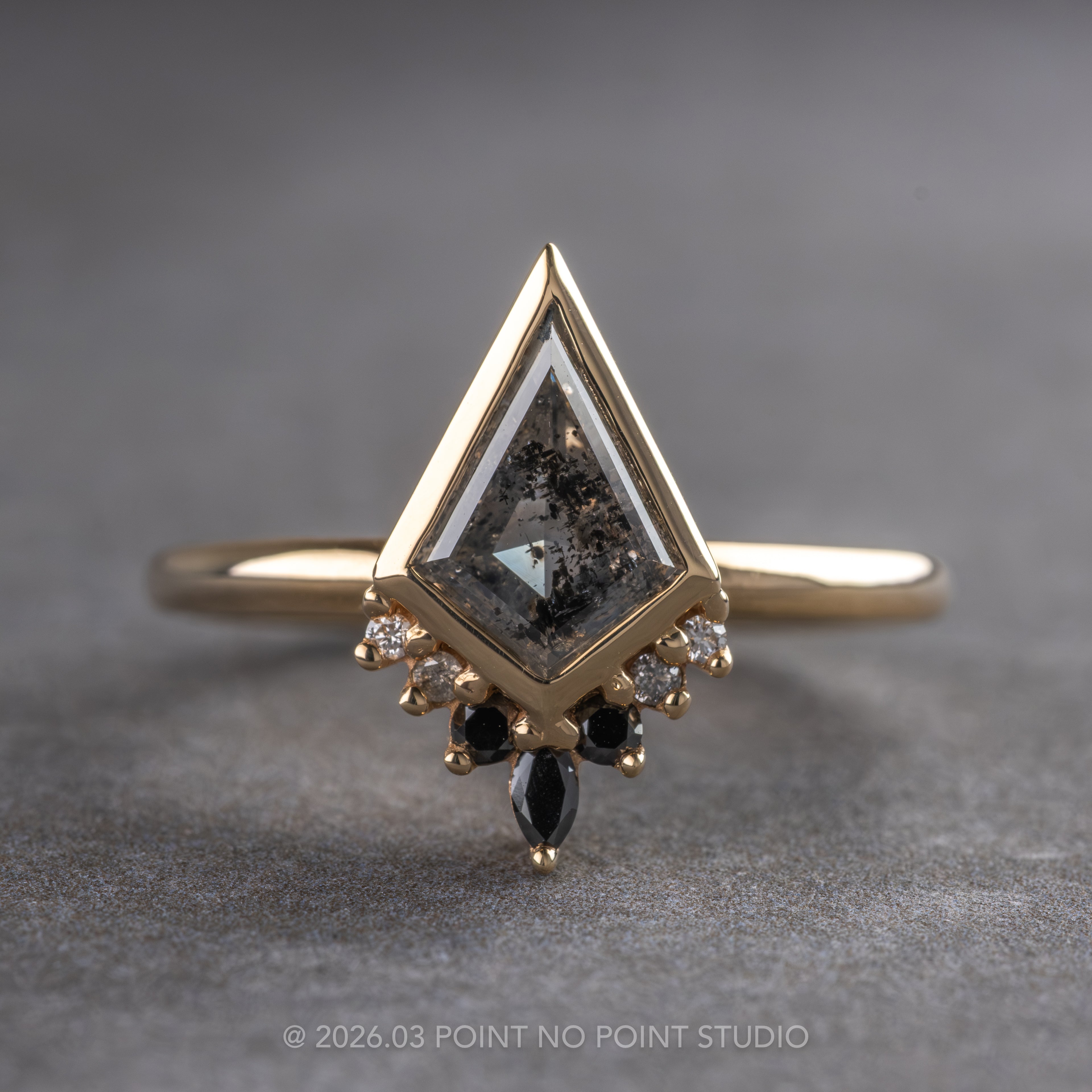 .98 Carat Salt and Pepper Kite Diamond Engagement Ring, Bezel Ombre Ava Setting, 14K Yellow Gold