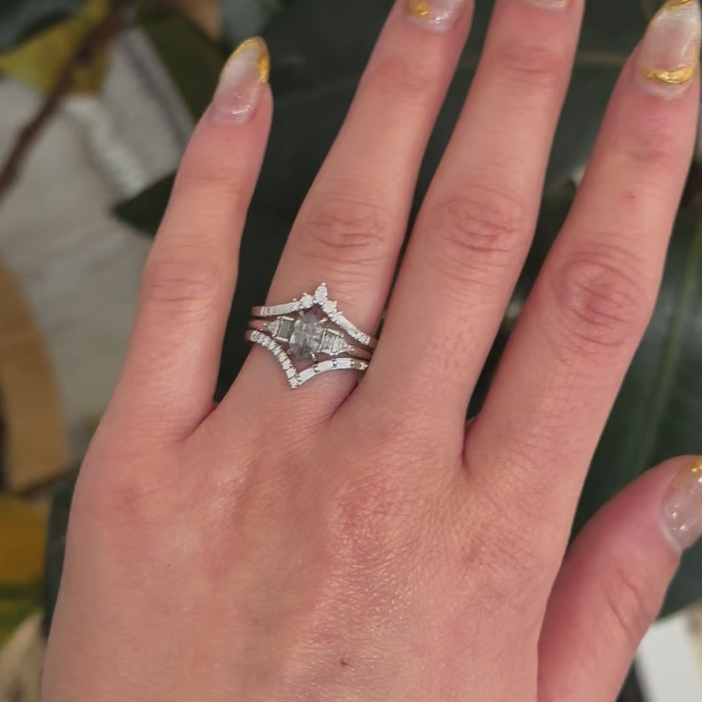 This unique and modern ring features a beautiful 1.14 carat natural salt and pepper rose cut hexagon diamond. The diamond is a top quality un-enhanced diamond; it is semi-translucent with unique speckling and facets that catch the light. Set on either side of the diamond is a beautiful salt and pepper baguette diamond accentuated by GHSI white triangle diamonds.