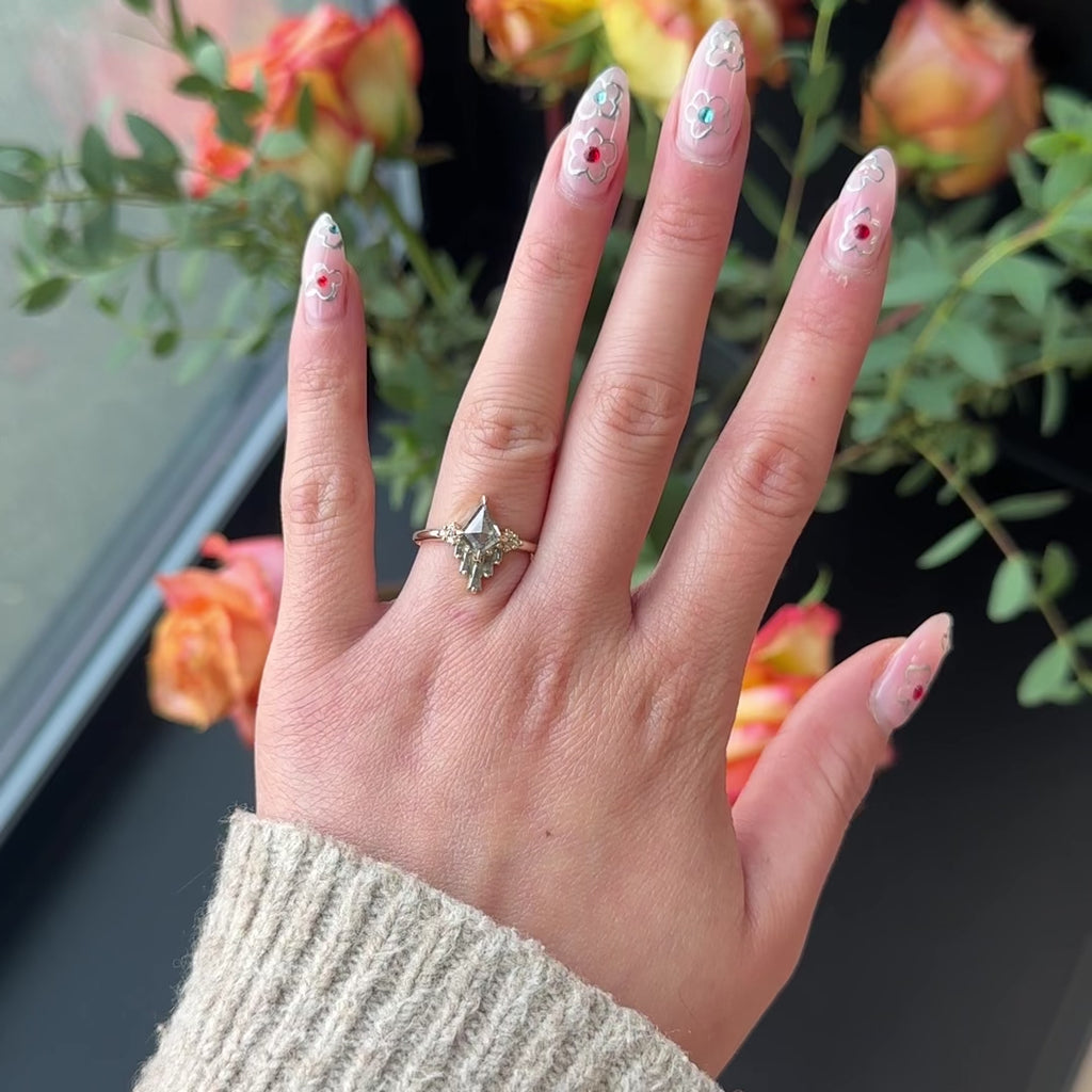 This beautiful ring features a stunning 1.24 carat salt and pepper kite rose cut diamond. The diamond is a top quality natural un-enhanced diamond; it is semi-translucent with unique tones and facets that catch the light. The kite diamond is flanked on either side by a cluster of sparkly white round accent diamonds and is adorned with a half-halo of salt and pepper baguettes.