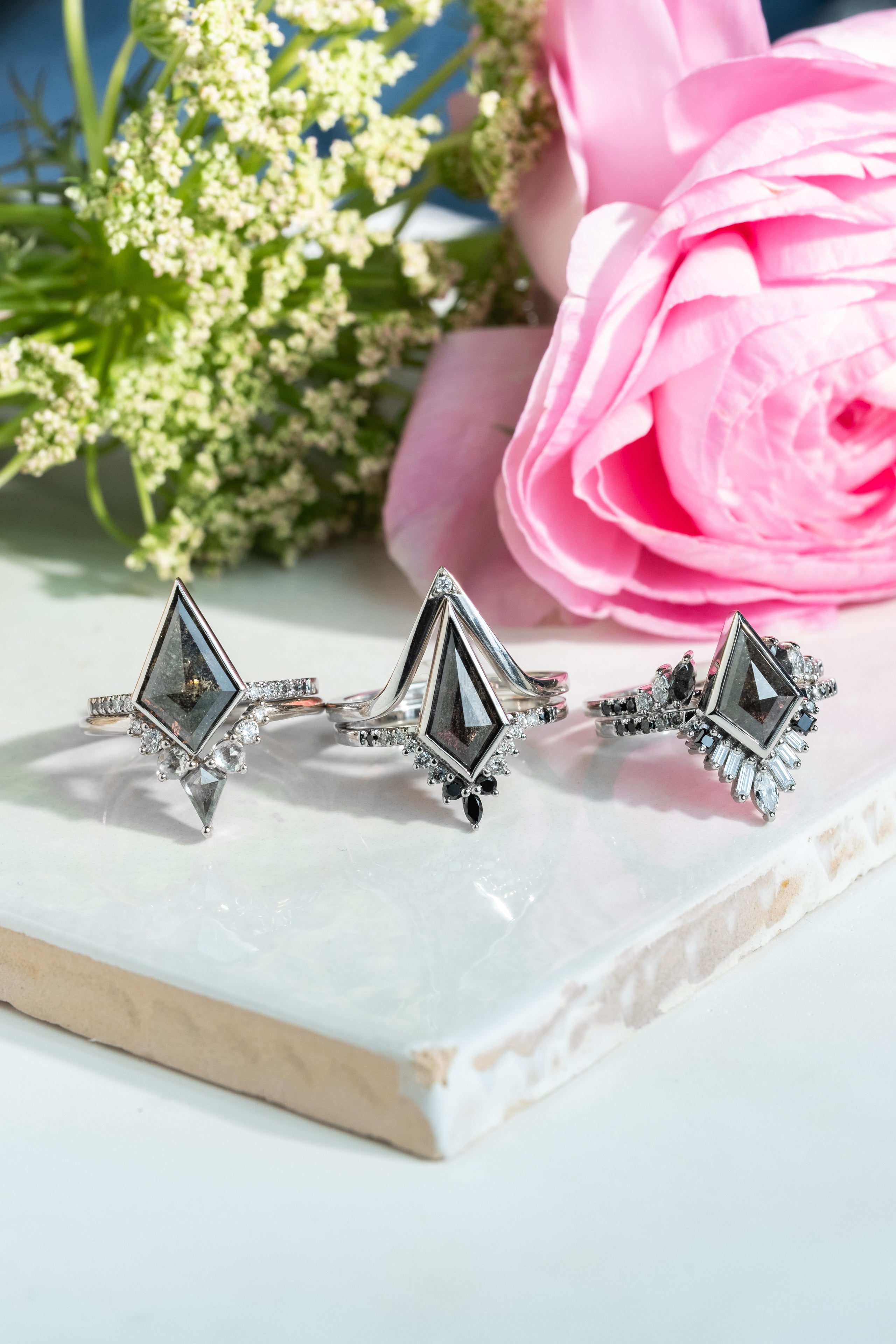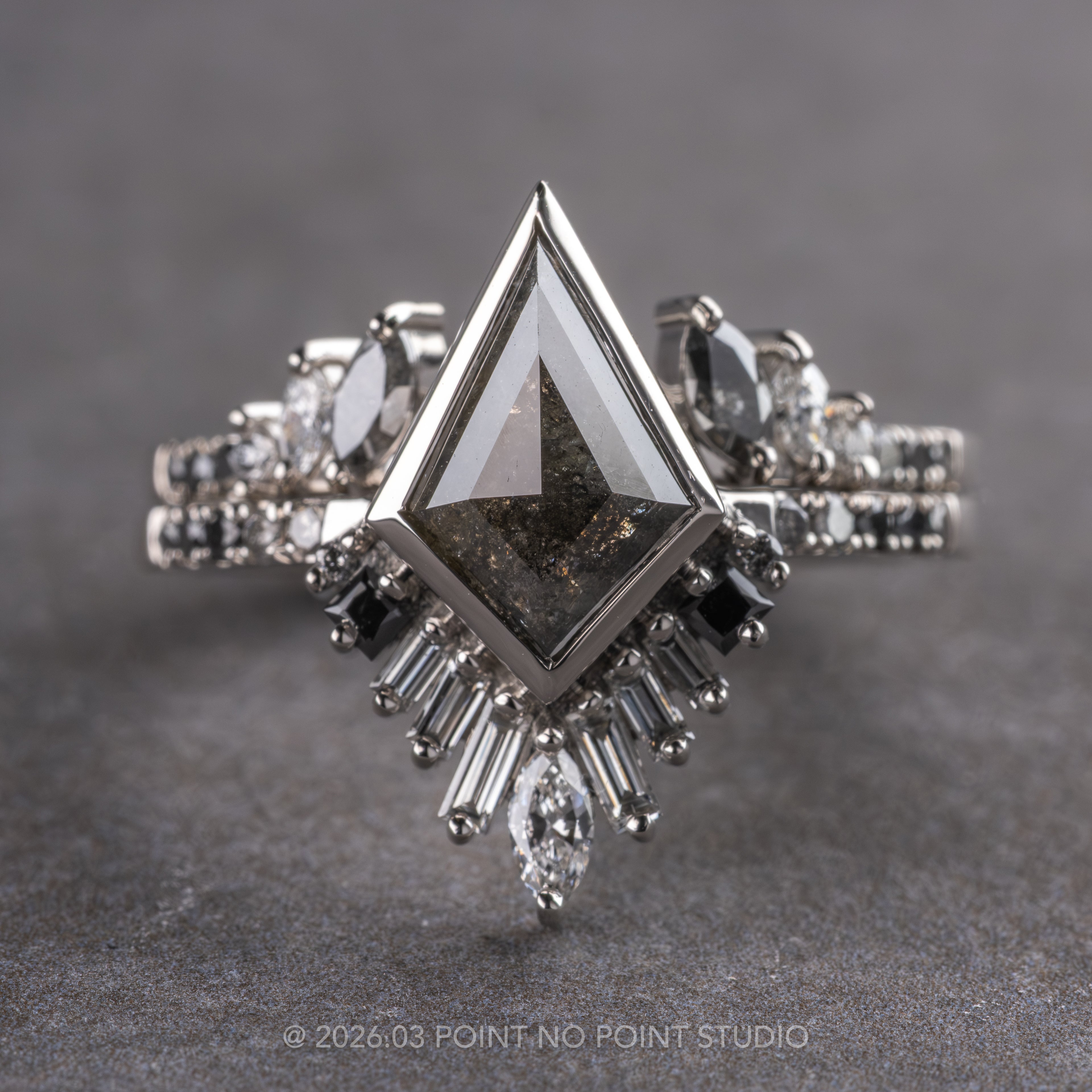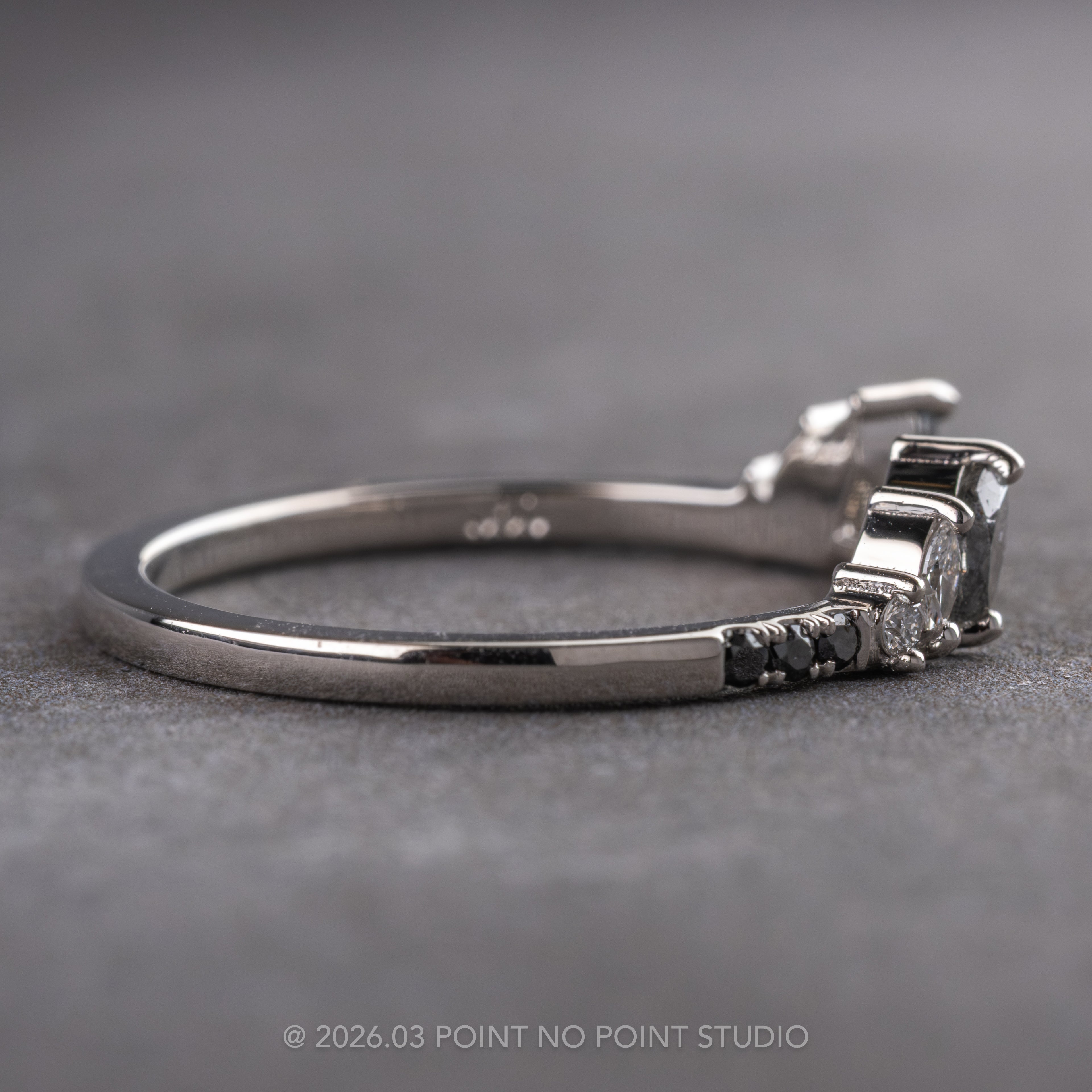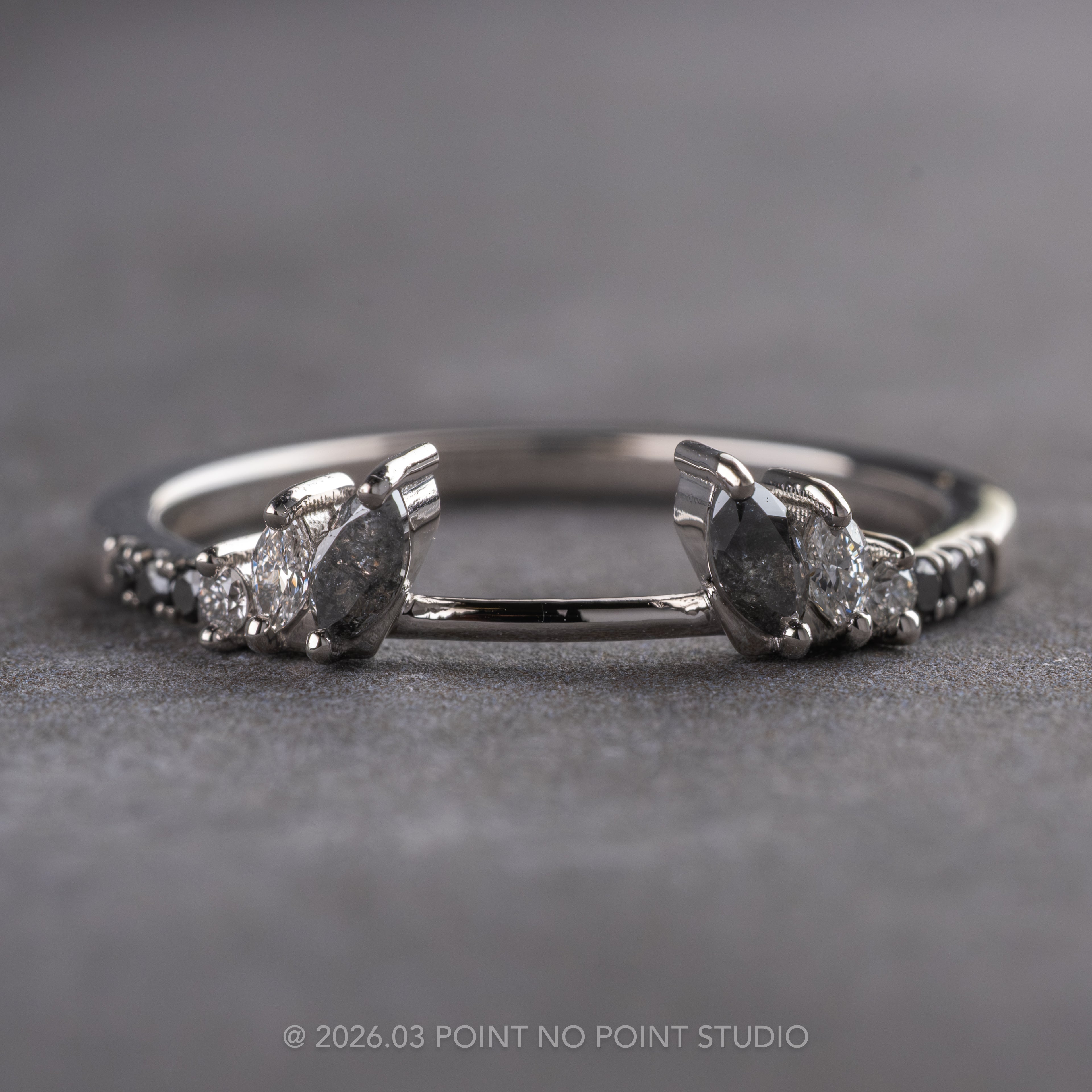 Set into the band on either side of the opening are black, grey, and white marquise and round diamonds for a stunning gradient effect! The entire ring is made in your choice of recycled 14k yellow, rose, peach or white gold or platinum with a 1.7mm wide band.