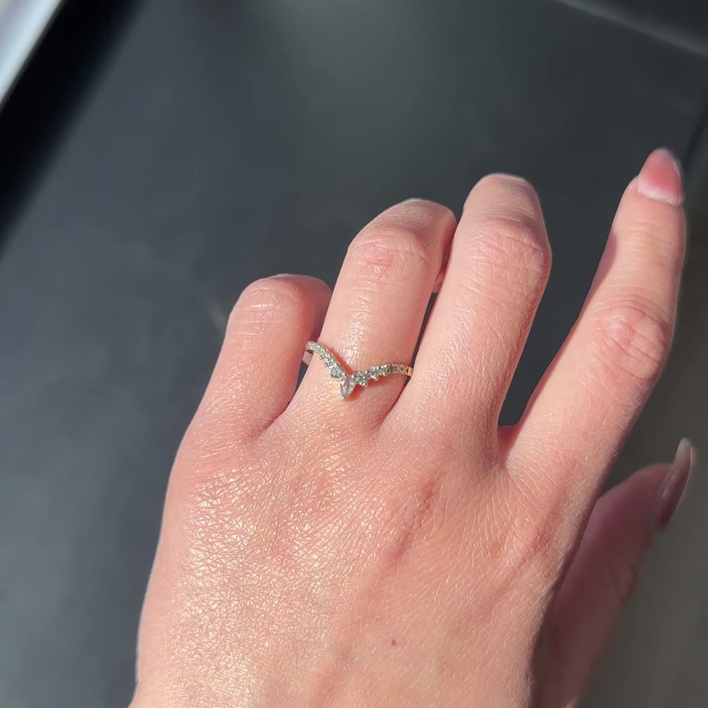 This stunning wedding ring features a v-contour of salt and pepper and grey diamonds with a striking salt and pepper rose cut pear diamond at the tip. This band can be worn alone, stacked in multiples or to match any number of engagement rings!