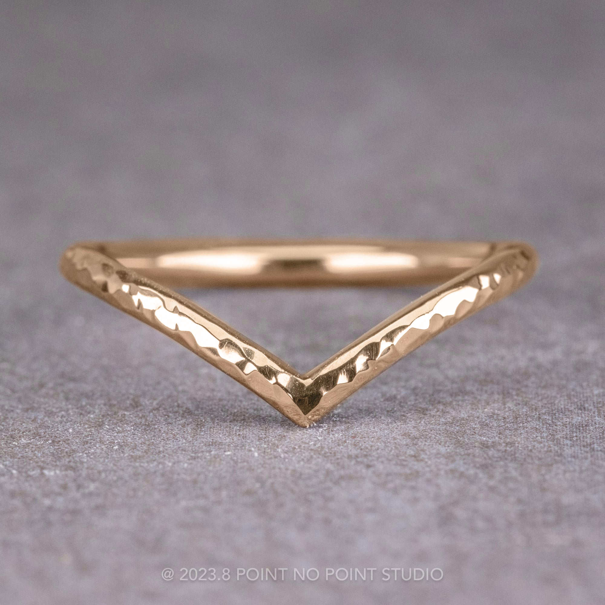 A simple hand crafted V shaped wedding band to be worn alone, stacked in multiples, or to match any number of engagement rings! The band measures 1.7mm round and curves elegantly into a contoured V and has a hammered finish.