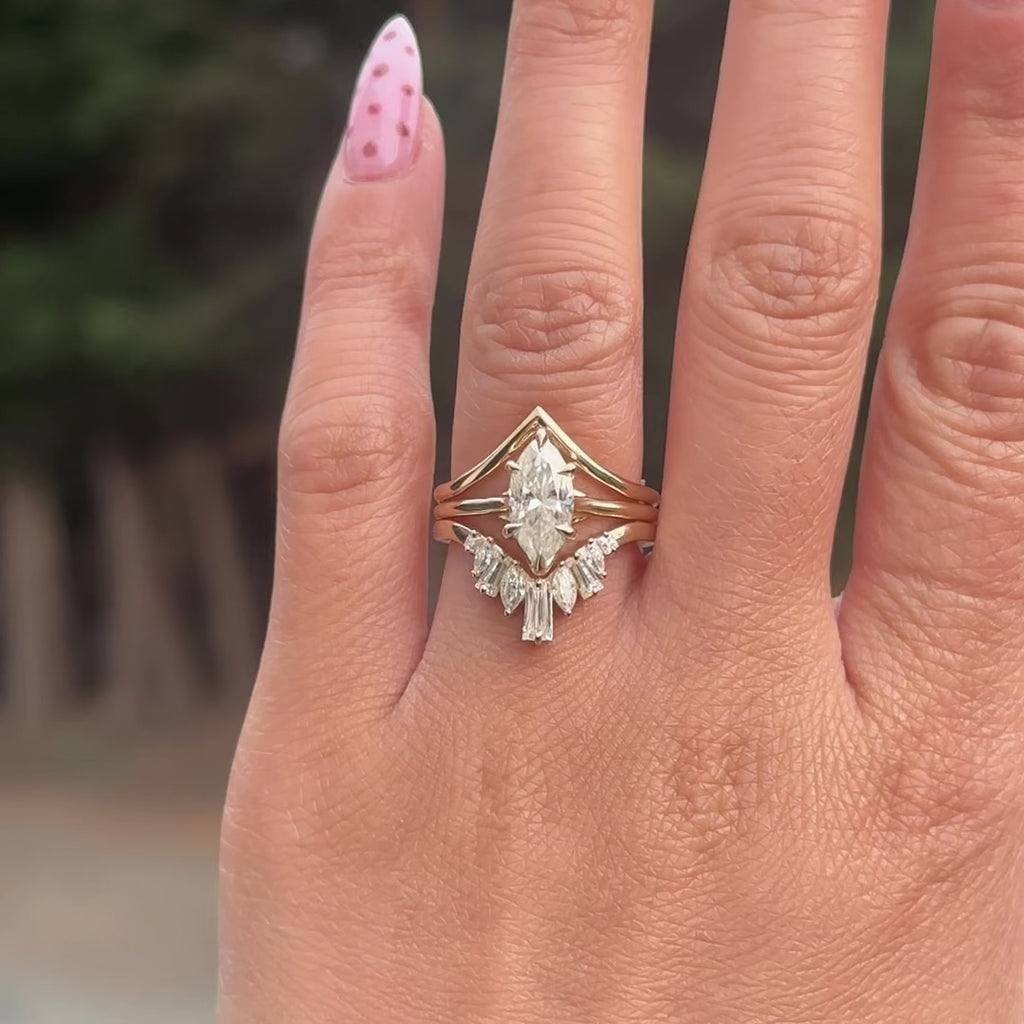 This stunning wedding ring features a v-contour of sparkly marquise, tapered baguettes and princess cut moissanites with a striking tapered baguette at the tip that will complement many different engagement ring styles! This band can be worn alone, stacked in multiples or to match any number of engagement rings.