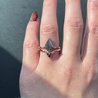 This stunning wedding ring features a v-contour of sparkly black and grey diamonds in various shapes, with a striking black marquise diamond at the tip that will complement many different engagement ring styles! This band can be worn alone, stacked in multiples or to match any number of engagement rings.