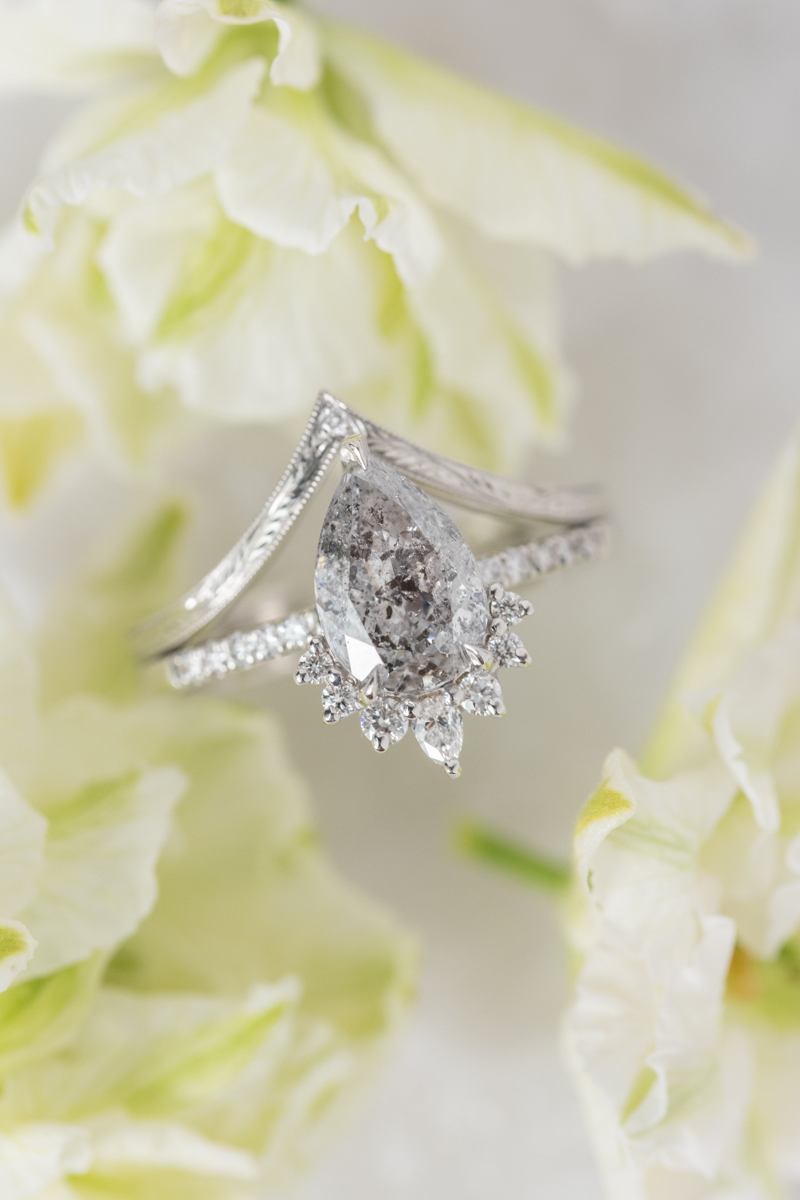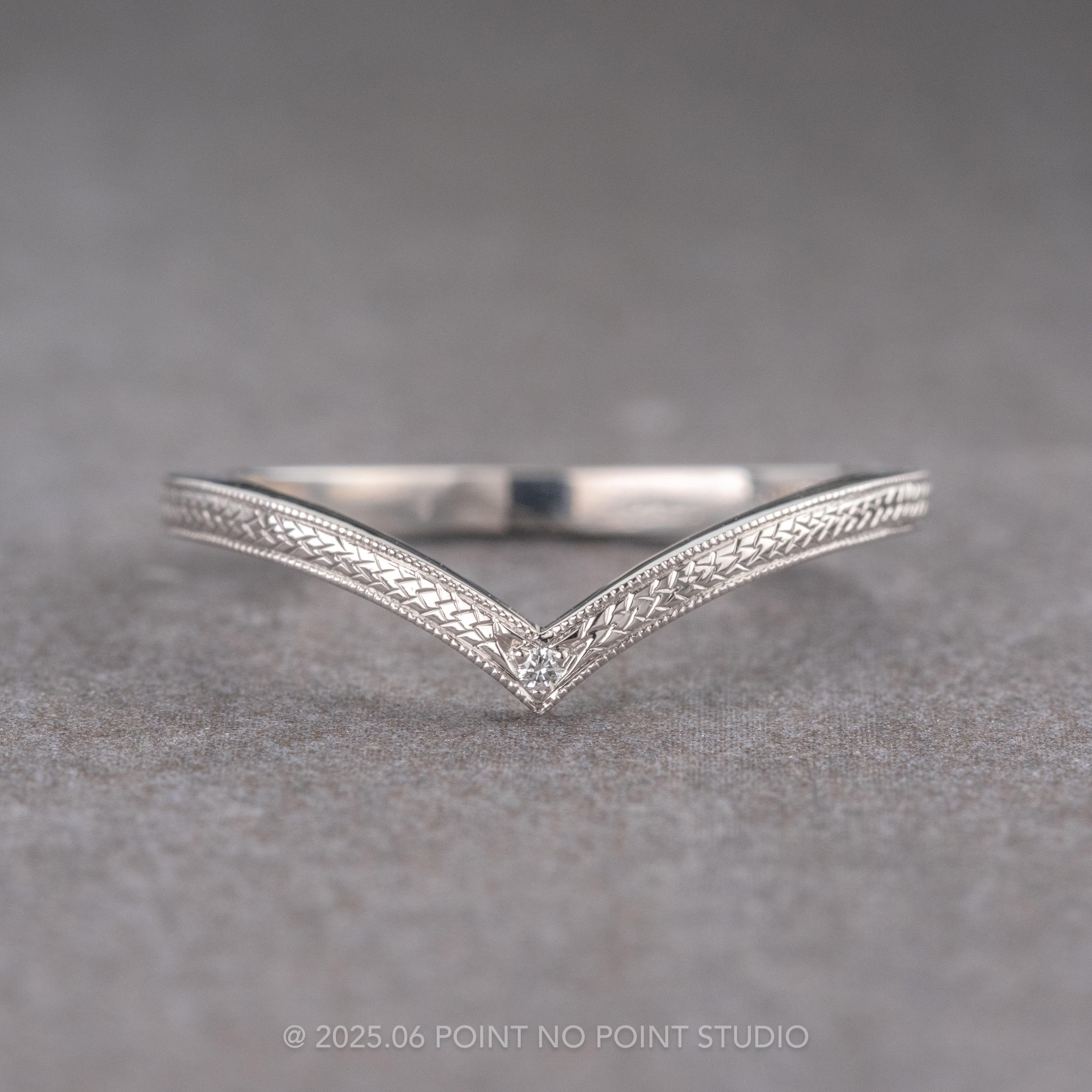 An elegantly enhanced version of our classic Vivian wedding ring with hand engraved ornate detailing. Set into the tip of the v-contour is a single GHSI white faceted diamond. This v-shaped wedding band can be worn alone, stacked in multiples, or to match any number of our PNPS engagement rings!