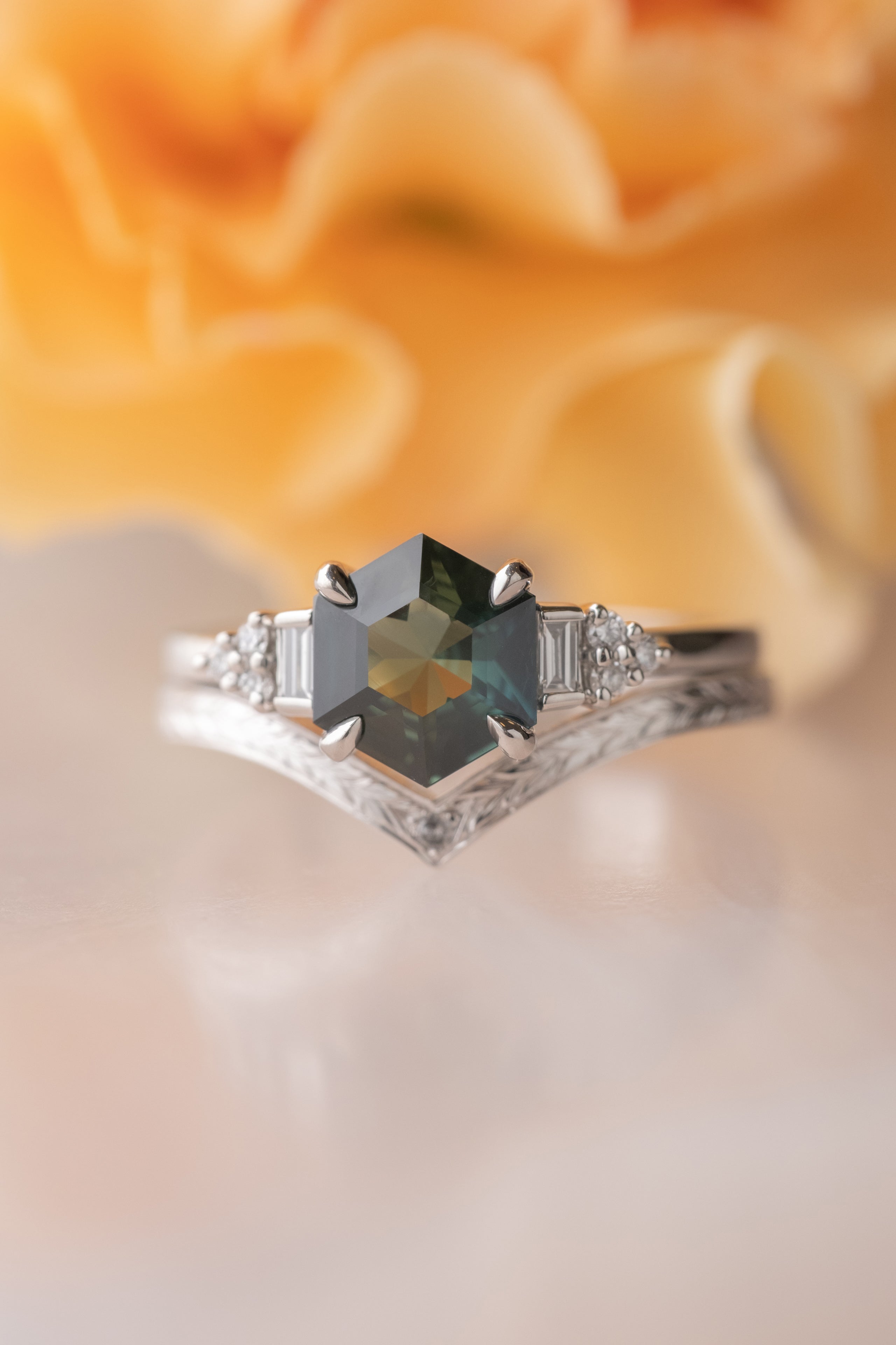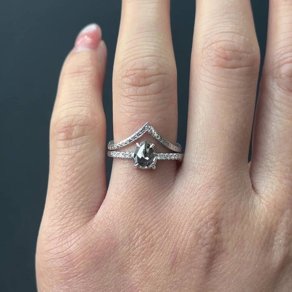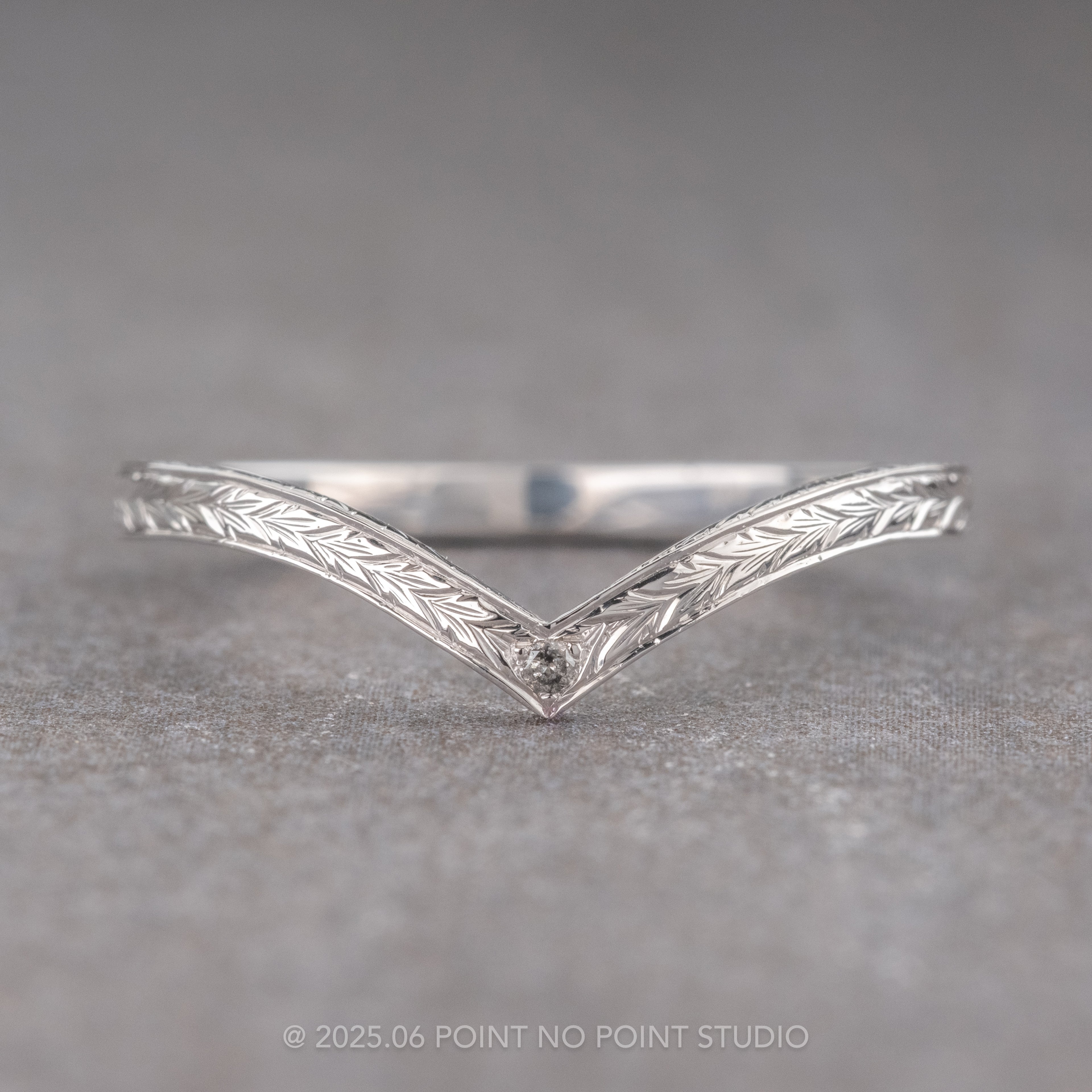 An elegantly enhanced version of our classic Vivian wedding ring with hand engraved ornate detailing. Set into the tip of the v-contour is a single silver faceted diamond. This v-shaped wedding band can be worn alone, stacked in multiples, or to match any number of our PNPS engagement rings!