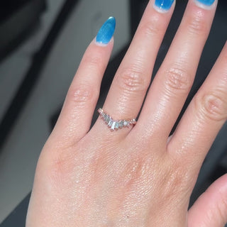 This timeless and unique wedding ring features striking white baguette diamonds accented by natural GHSI marquise and round diamonds in a softly contouring style that will complement many different engagement ring styles!