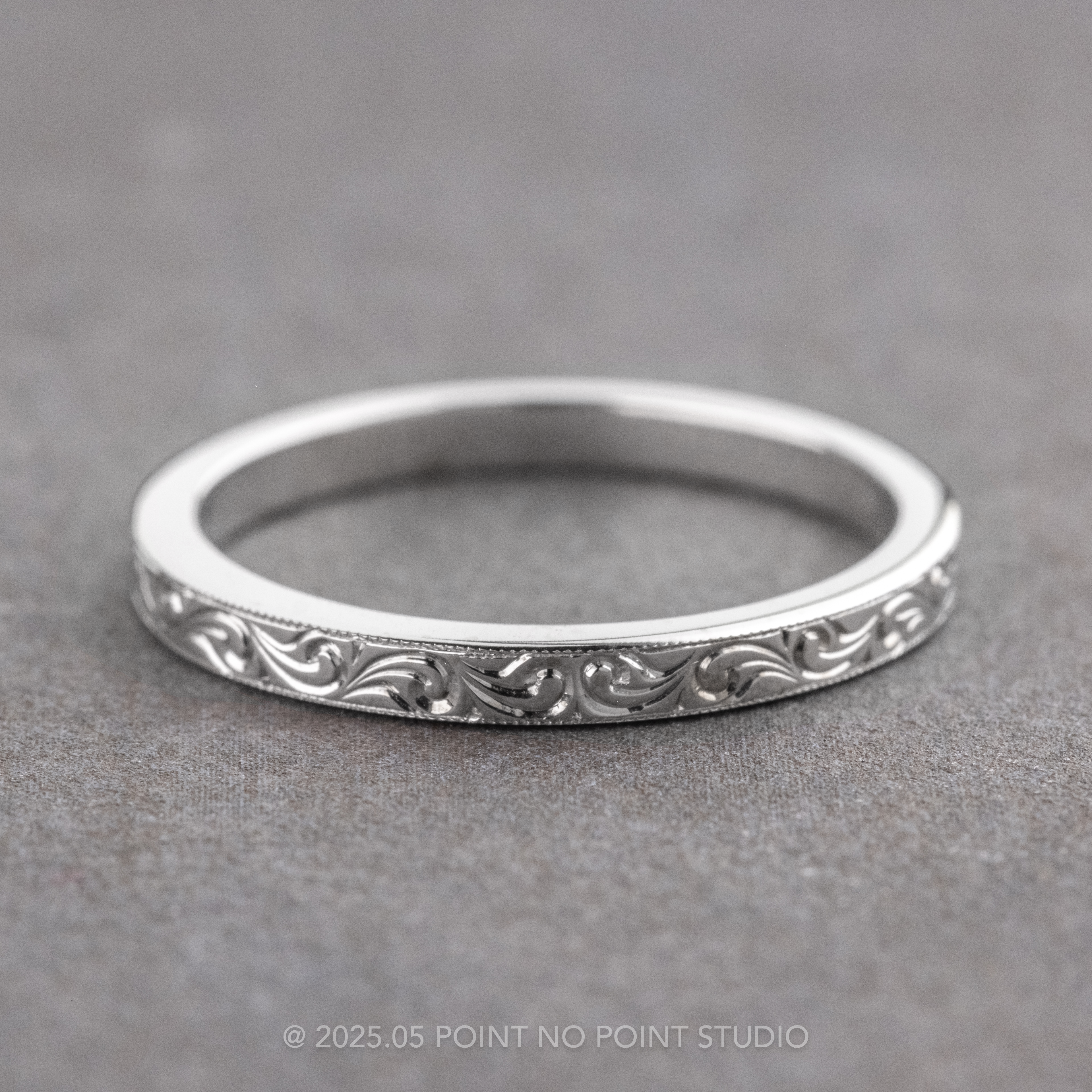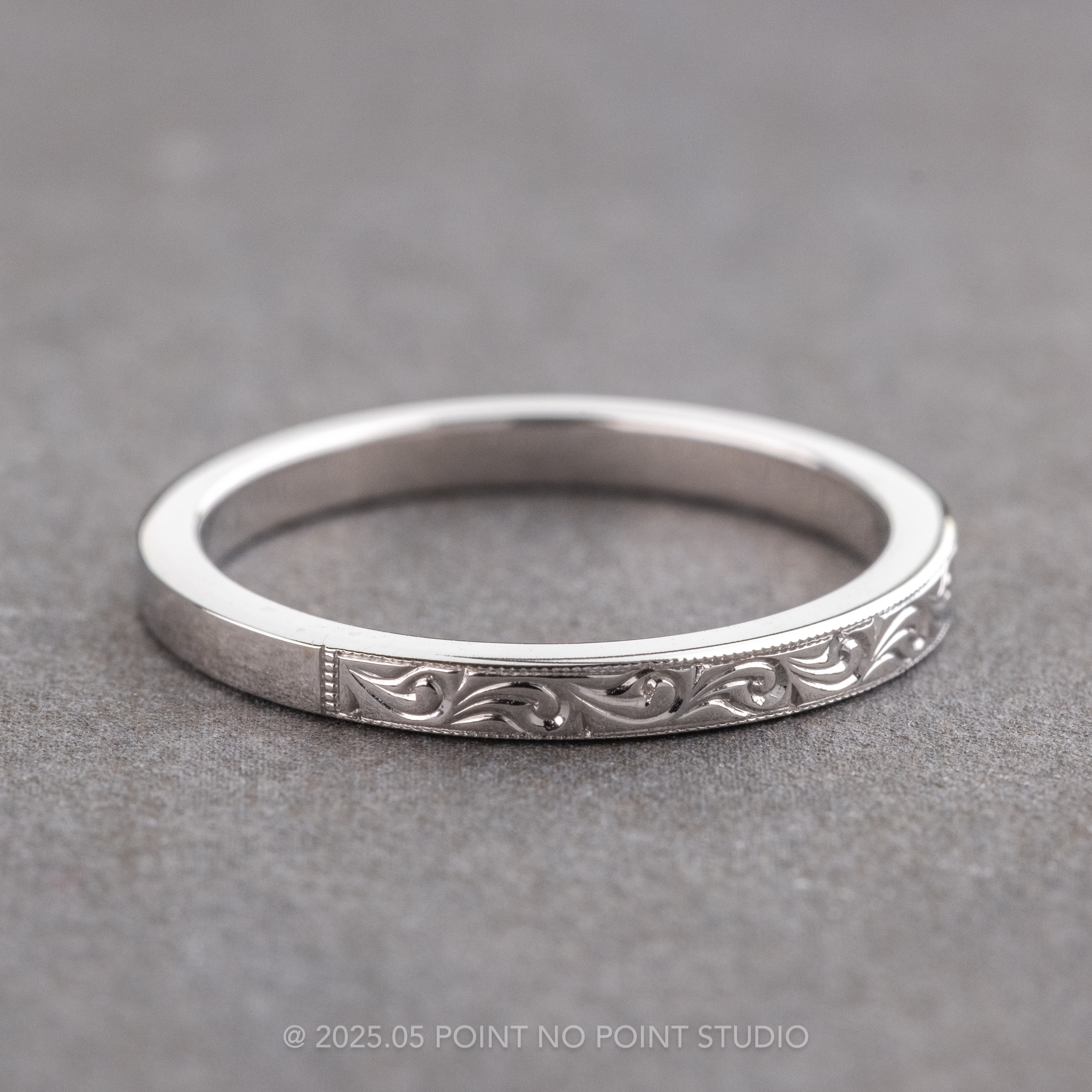 Our jeweler hand engraved traditional scroll on the top of the band, with milgrain detailing along the edges. Engraving continues three-quarters of the way around the band, leaving a small sizing bar at the back.