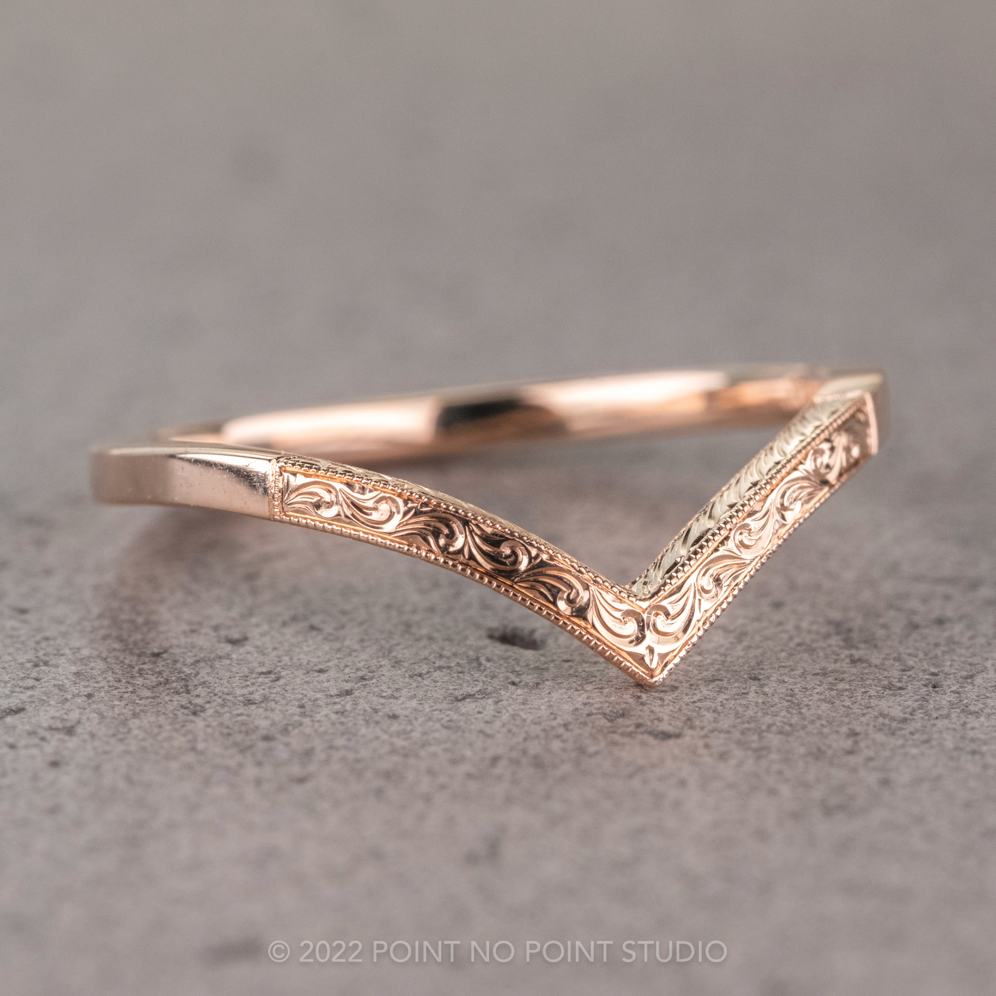An elegantly enhanced version of our classic Vivian wedding ring with hand engraved ornate detailing. This v-shaped wedding band can be worn alone, stacked in multiples, or to match any number of our PNPS engagement rings!