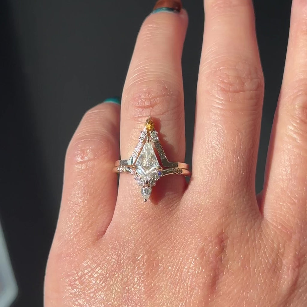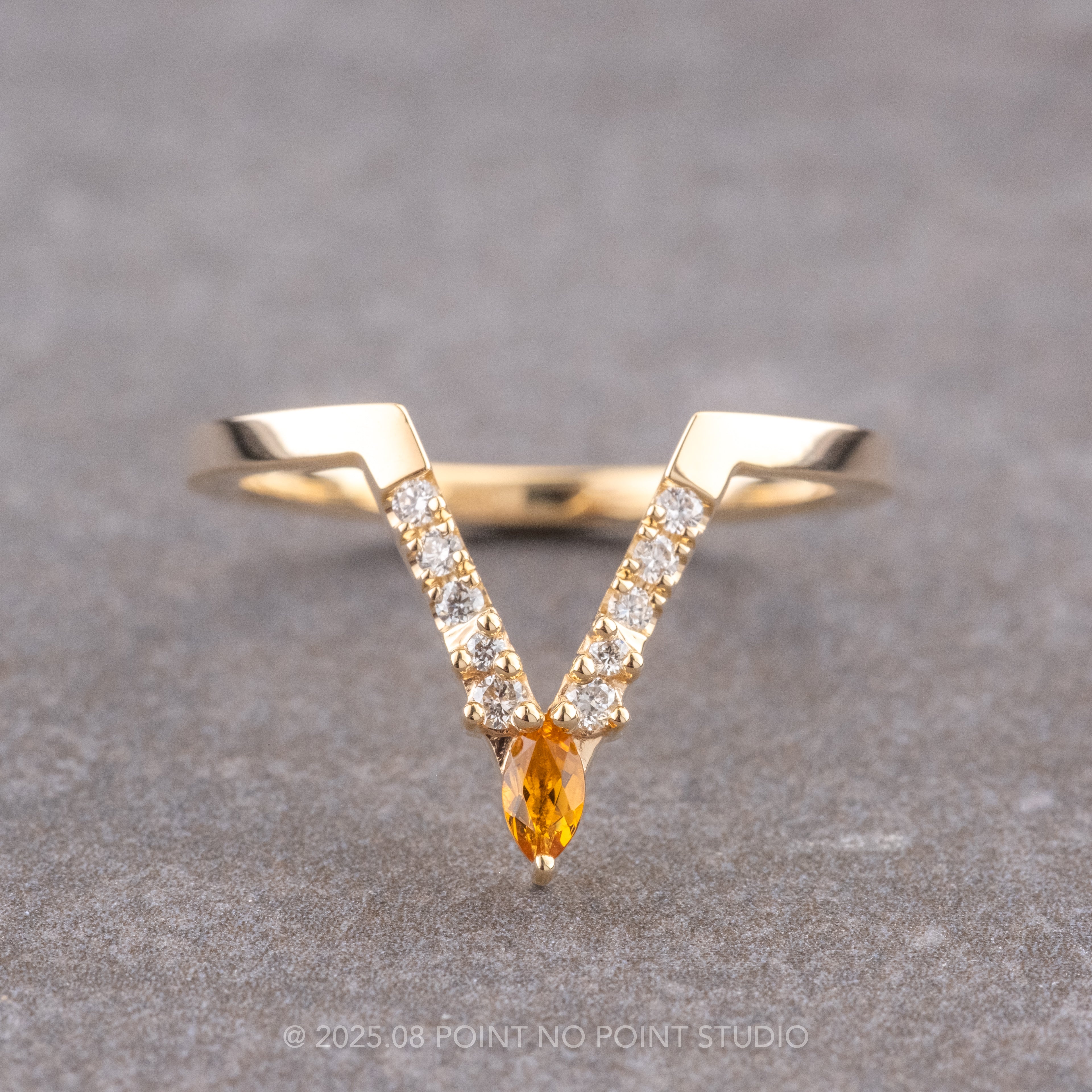 This timeless and unique wedding ring features a v-contour of GHSI white diamonds with a stunning marquise citrine as the focal point. This v-shaped diamond band can be worn alone, stacked in multiples or to match any number of engagement rings!