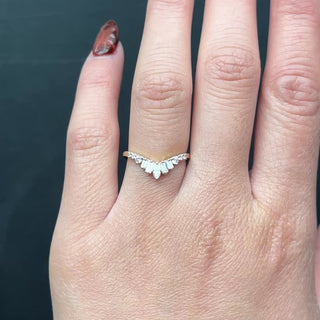 This timeless and unique wedding ring features a v-contour of GHSI white diamonds in various shapes with a stunning marquise diamond as the focal point. The different diamond shapes create a truly unique profile and design that will set off just about any engagement ring!