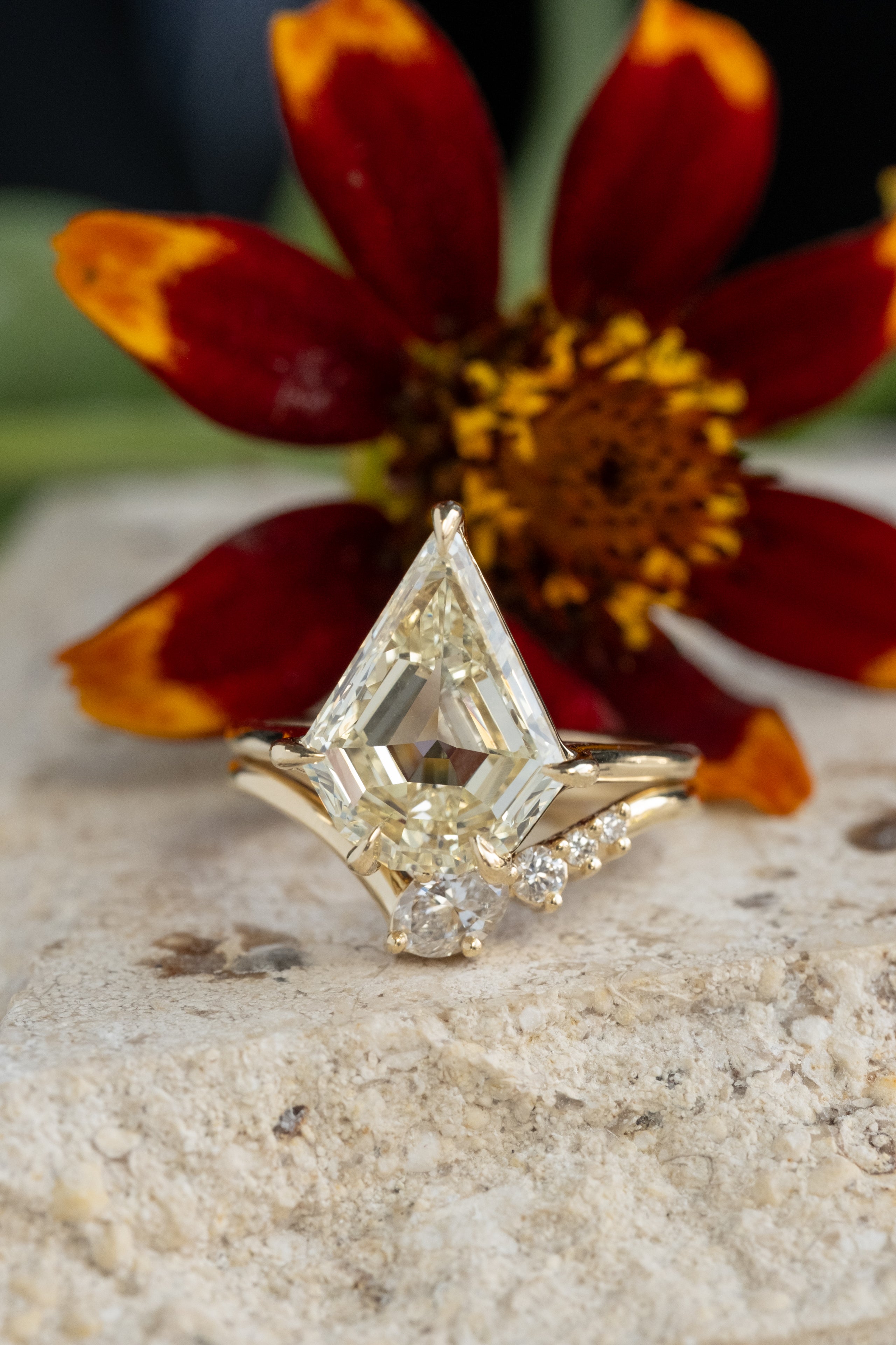 The entire ring is made of recycled 14k yellow gold; the settings for the stones were made to be low profile and comfortable for everyday wear.