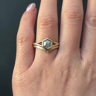 This ring features a stunning natural salt and pepper speckled hexagon double cut diamond - the hand cut diamond is a top quality natural, non enhanced or treated diamond and is semi-translucent with unique tones and facets that catch the light.