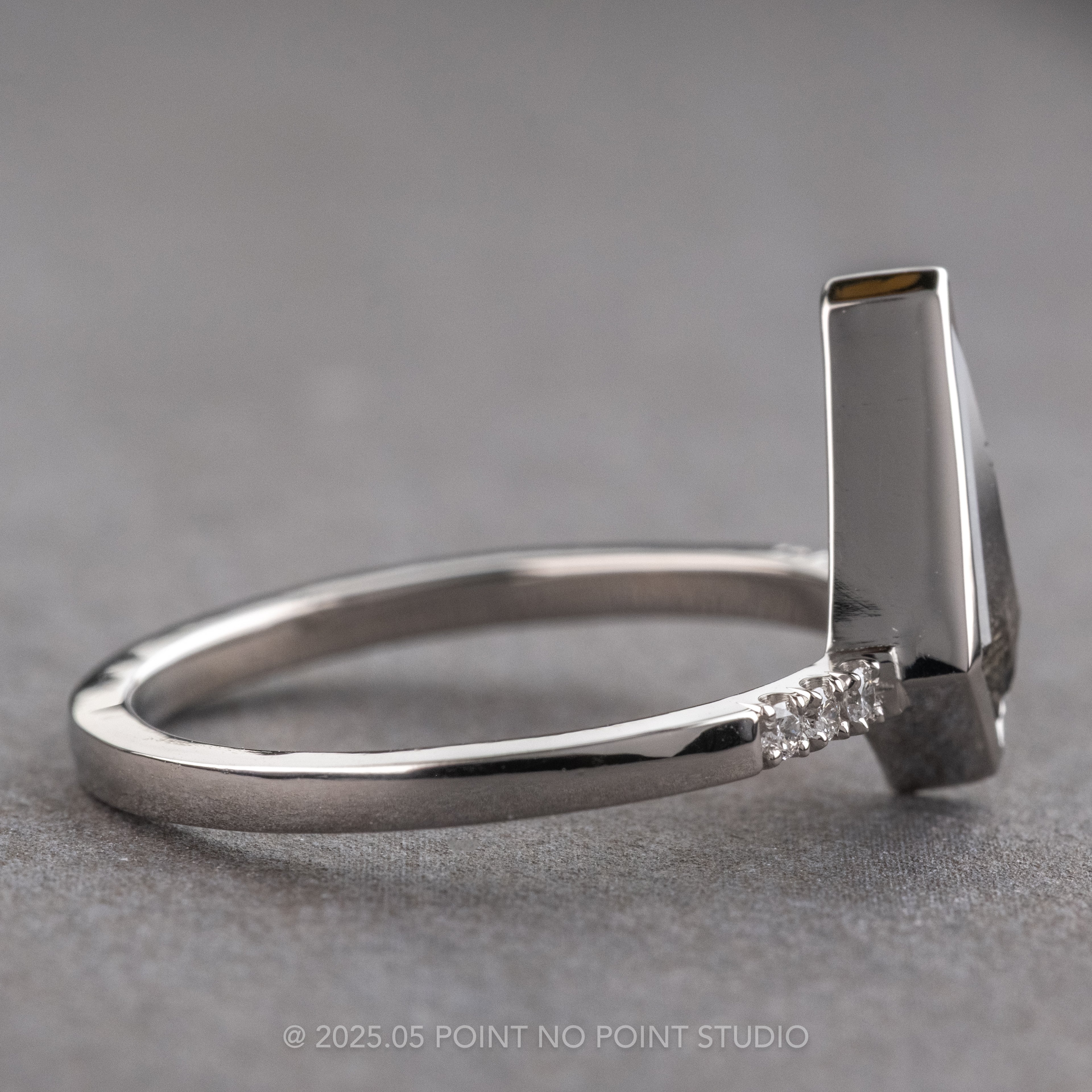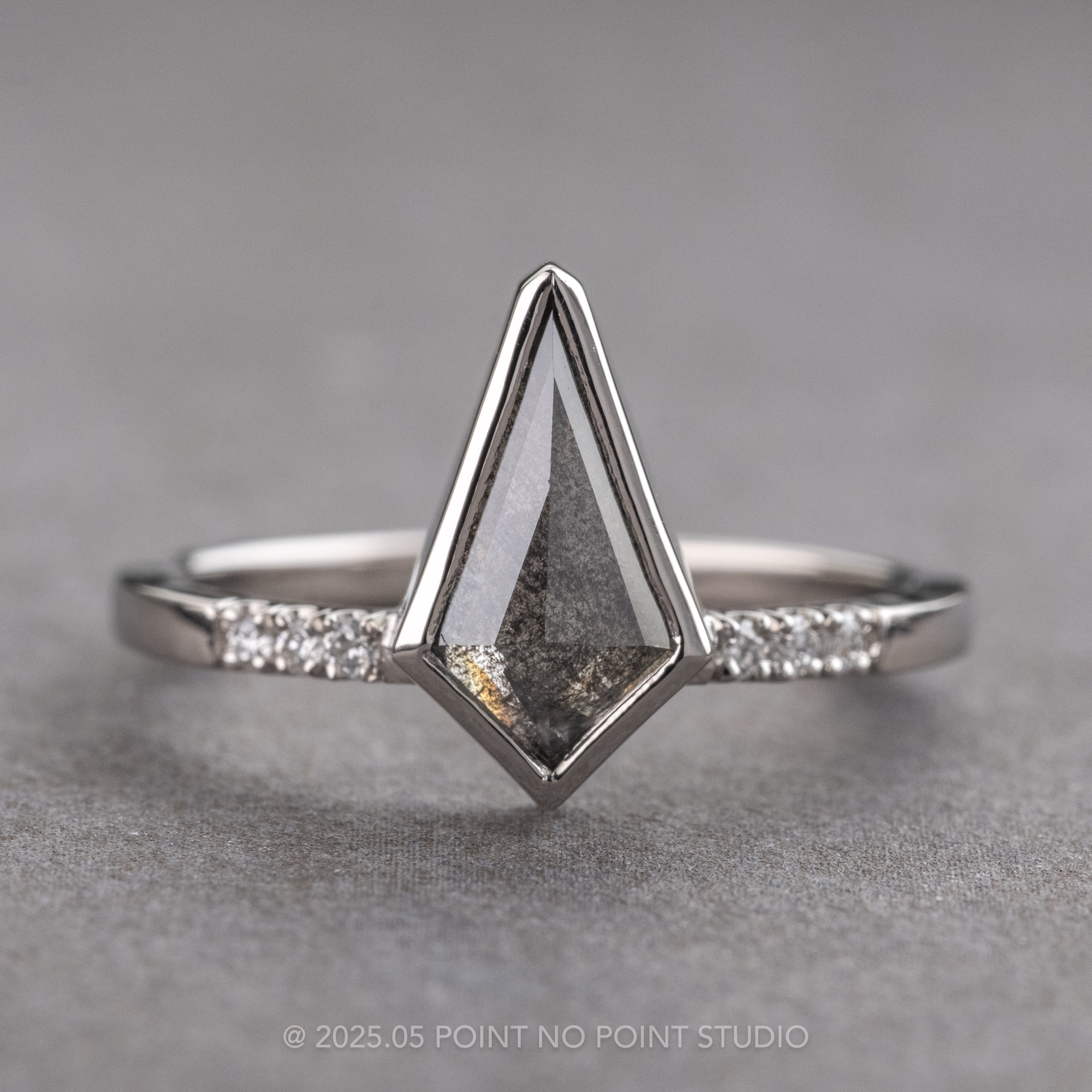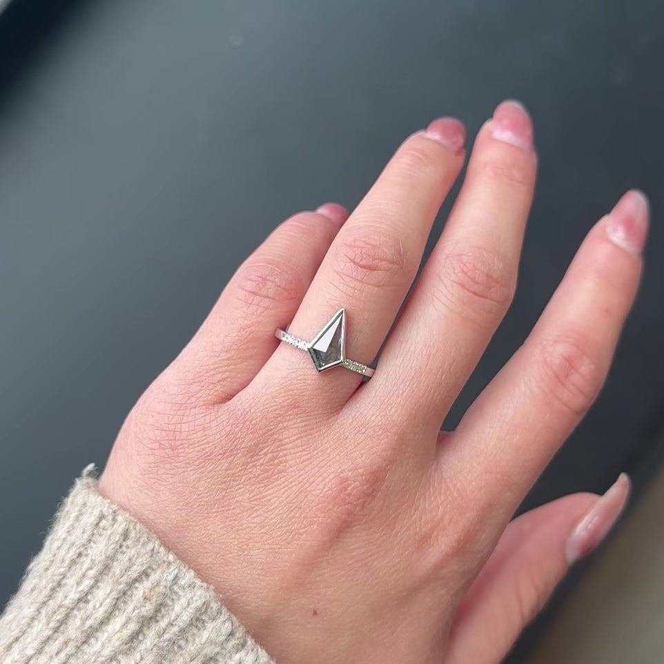 This engagement ring features a 1.02 carat semi-translucent black speckled kite shaped diamond. The diamond is a top quality, all-natural stone that has not been heat treated or enhanced in any way. There are three sparkly GHSI white brilliant cut round accent diamonds set into the ring band on each side of the kite diamond for that extra sparkle!