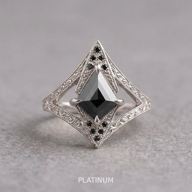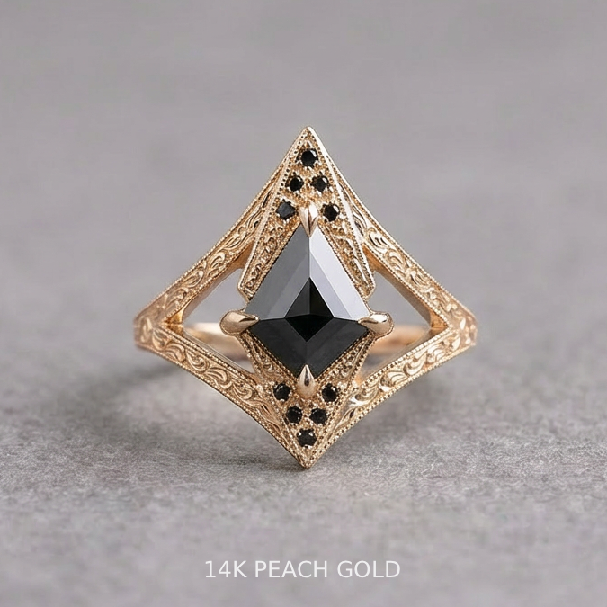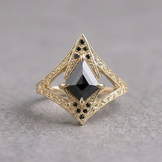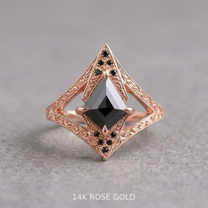 1.24 Carat Black Kite Diamond Engagement Ring, Engraved Arwen Setting