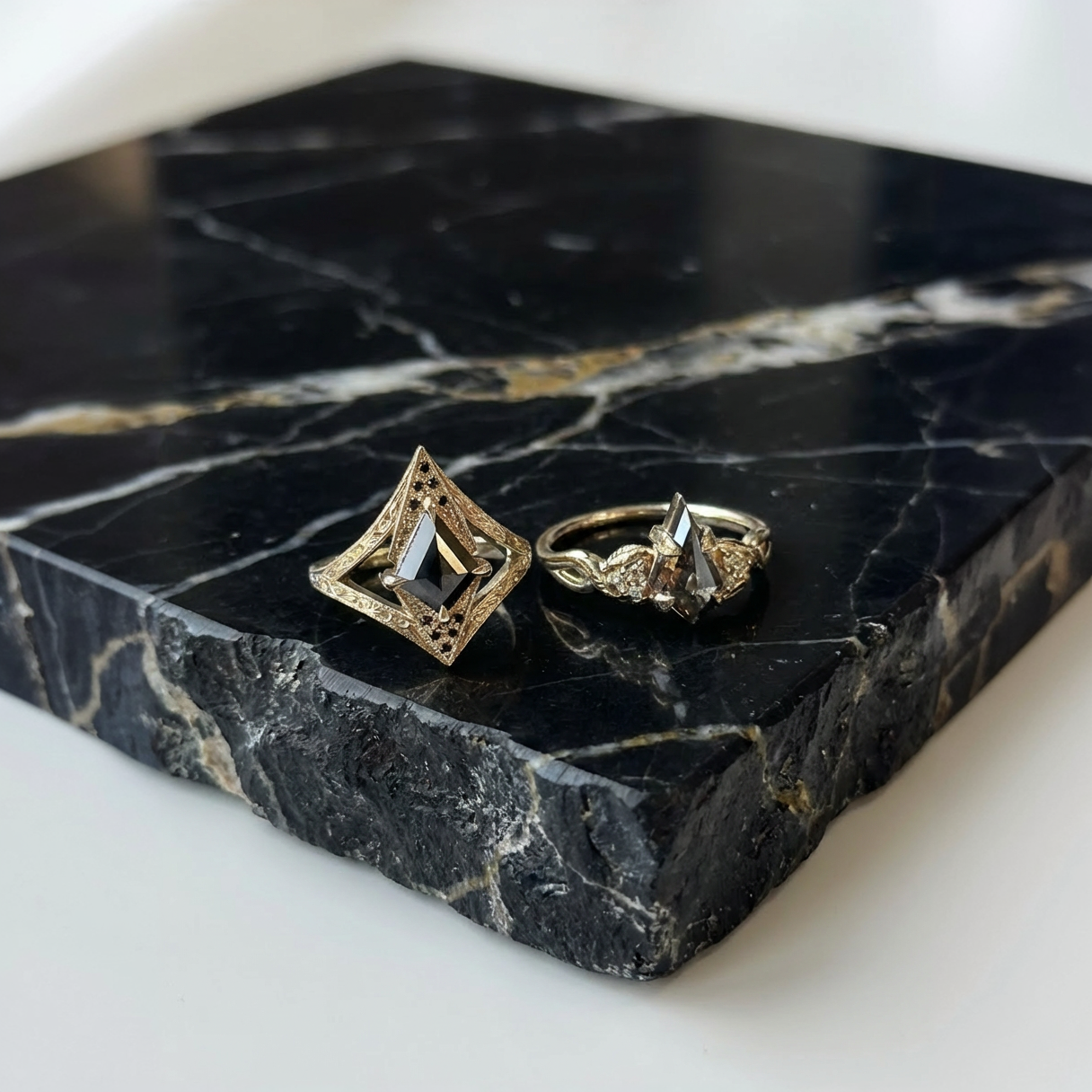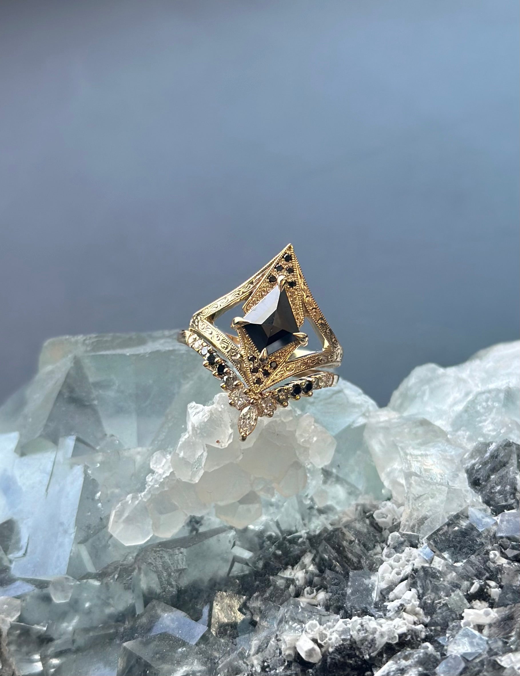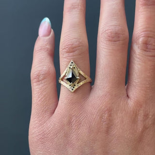This magical ring features a stunning natural and hand-faceted opaque black kite shape rose cut diamond. The diamond is set into an open back setting to allow light to illuminate through the diamond. The setting has an elegant hand engraved design as well as milgrain detailing around the black accent diamonds.