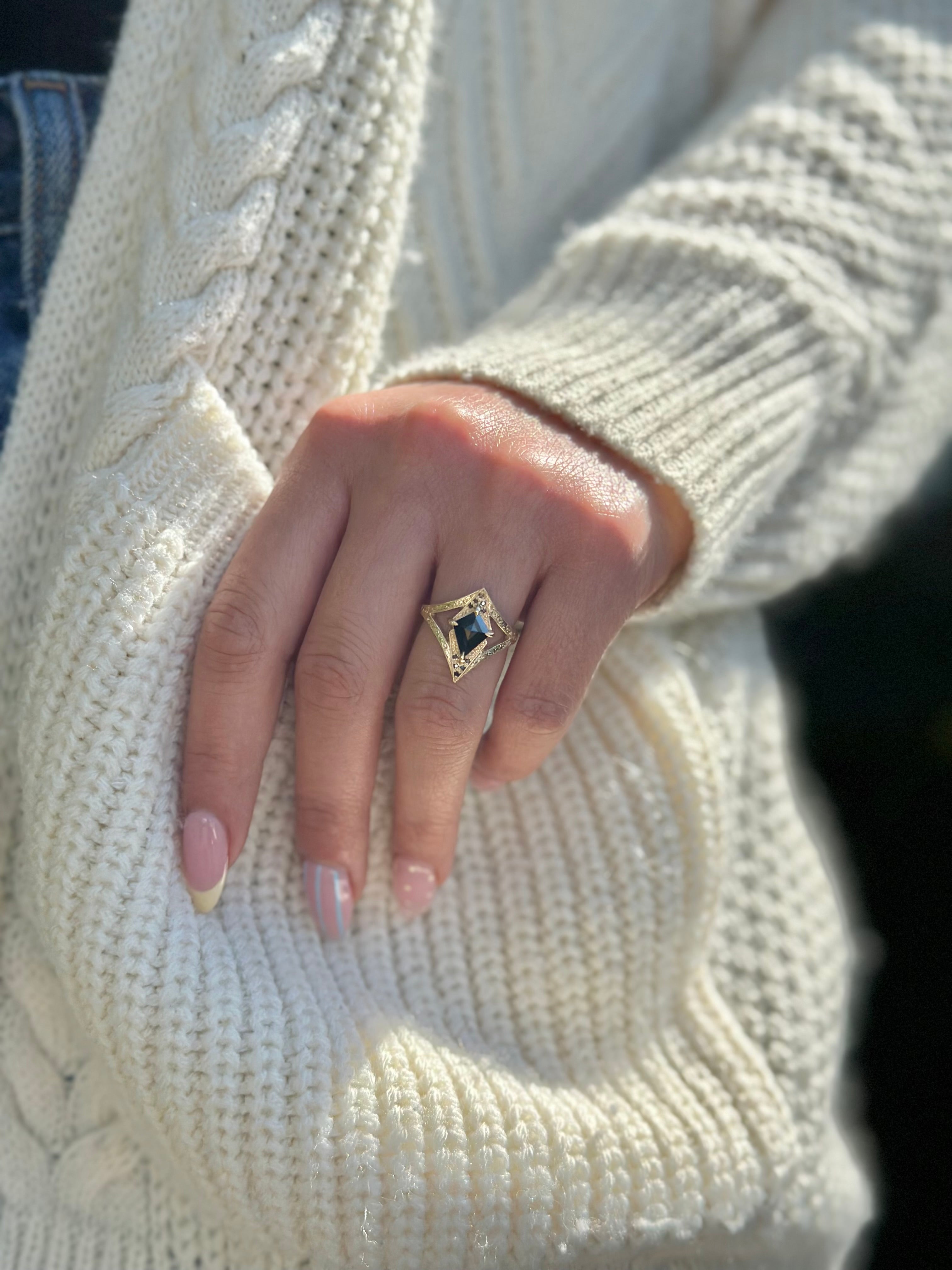 The kite diamond is set into a very low profile, 4 prong setting that allows the entire ring to sit directly on the finger - making this stunner suitable for everyday wear. The ring band is 1.7mm in width and has a split shank design. The band is also adorned with our Vintage Nightingale hand engraved scroll pattern. The entire ring is made in your choice of recycled 14k yellow, rose, or peach gold or platinum.