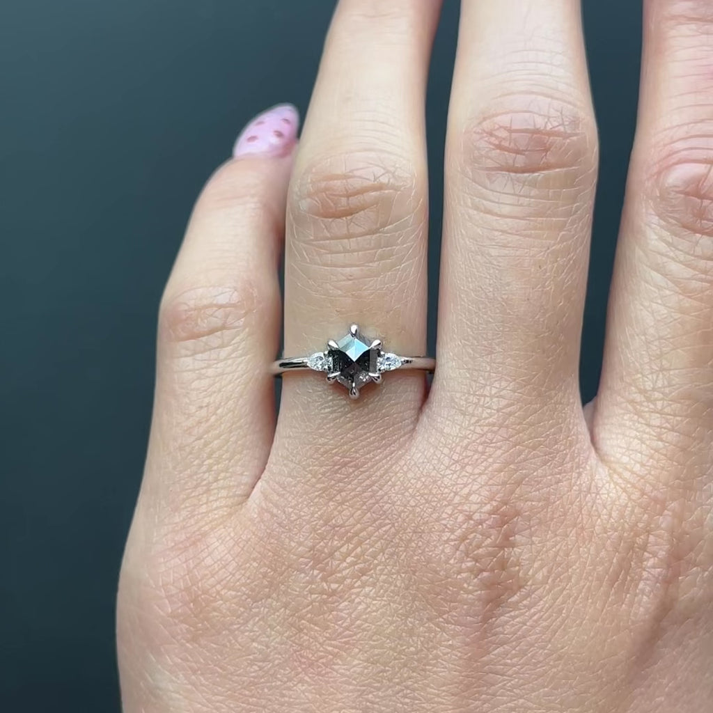 1.25 Carat Black Speckled Hexagon Diamond Engagement Ring, Zoe Setting, 14k White Gold