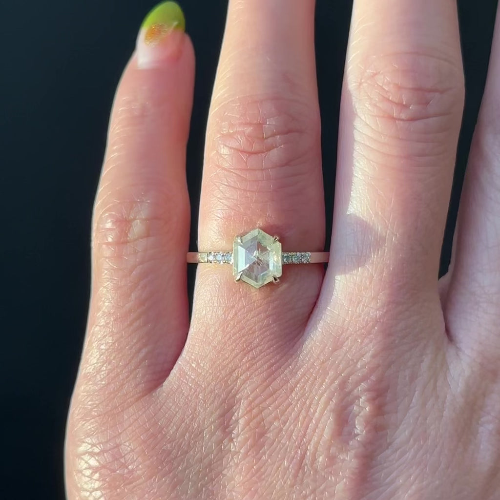 This engagement ring features a 1.28 carat semi-translucent icy white hexagon shaped rose cut diamond. The diamond is a top quality, all-natural stone that has not been heat treated or enhanced in any way. There are three sparkly GHSI white brilliant cut round accent diamonds set into the ring band on each side of the diamond for that extra sparkle!