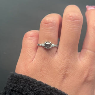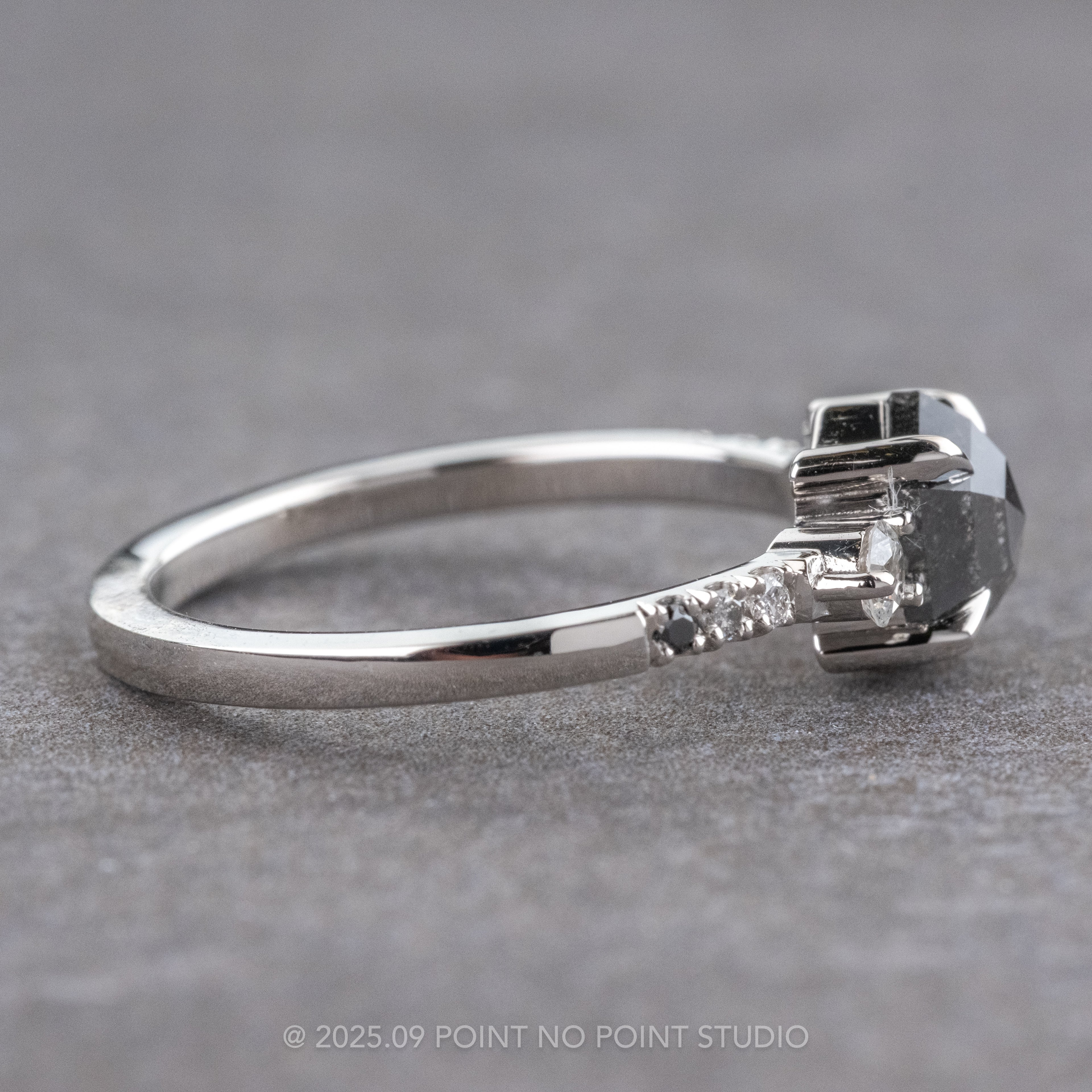 This engagement ring features a striking 1.20 carat black speckled rose cut hexagon shaped diamond. This diamond is an all-natural stone that has not been heat treated or enhanced in any way. Flanked on both sides by a GH-SI white round brilliant cut accent diamonds. Followed by three ombre diamonds down each side of the rings band - white closest to the larger white accent diamond, grey and black most outward on band.